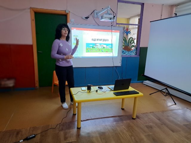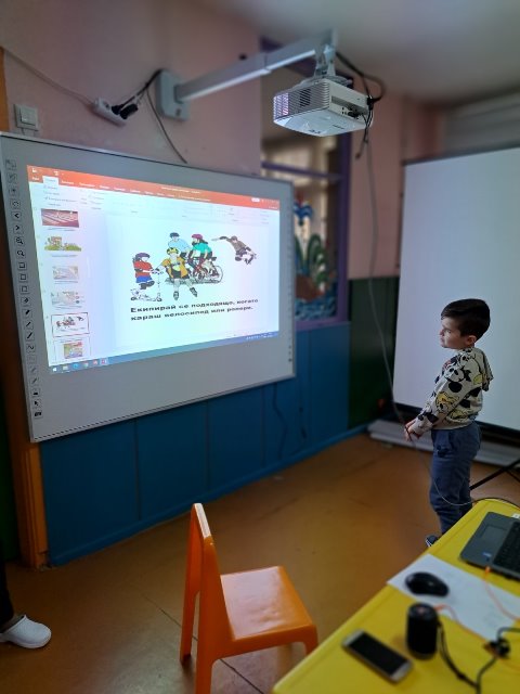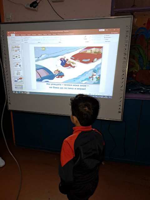 На 20 януари 2023 г. г-жа Валентина Стоянова представи презентация по БДП на тема: "Къде играят децата" на децата от групите: "Зайче", "Врабче", "Щурче" и "Ежко". Акцентът беше върху това кое място е опасно за игра /пътното платно, спрелите превозни средства, пред гаражните врати, тротоара и други/ и кои са безопасните места за игра (детската площадка, зелените площи, велоалеите, игрищата и др.)