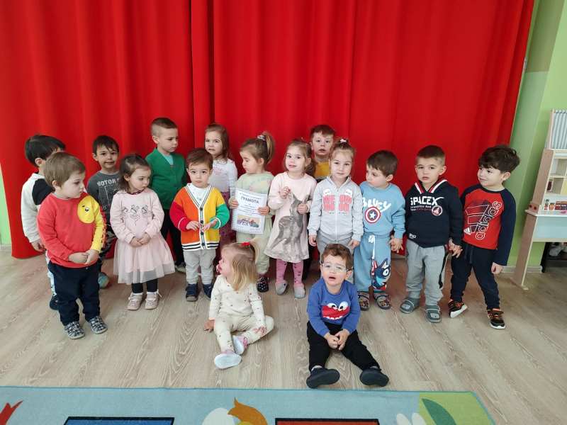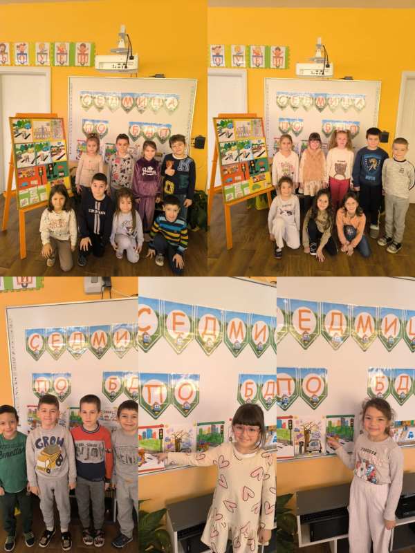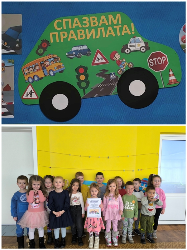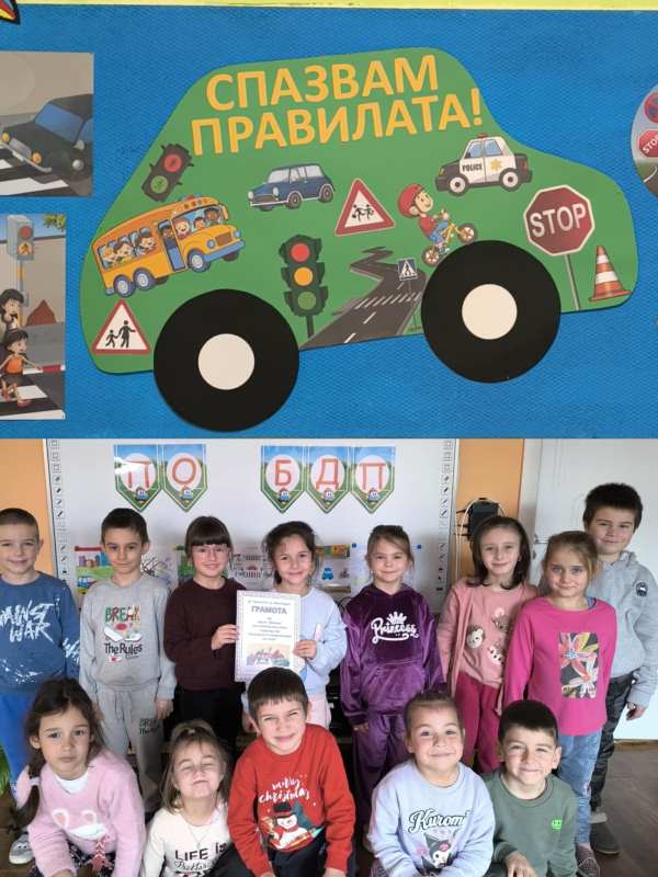 В четвъртък на децата бе представена презентация на тема "Безопасност на движението по пътя" с цел затвърдяване на придобити от децата компетентности, свързани с транспортната култура. В петък педагогическият екип изработи табло на тема "Спазвам правилата", което бе поставено на видно място.