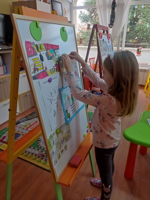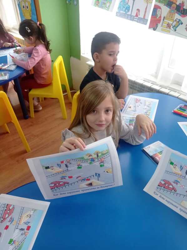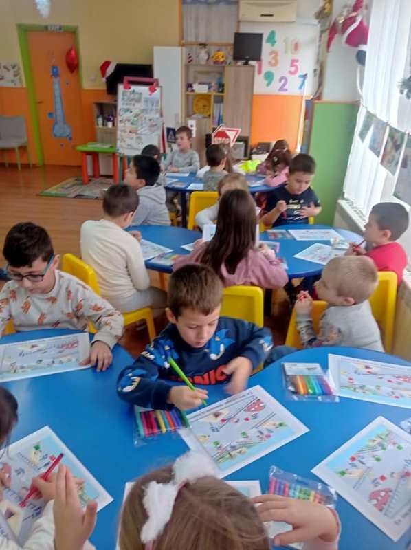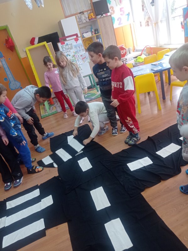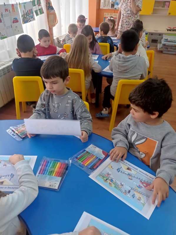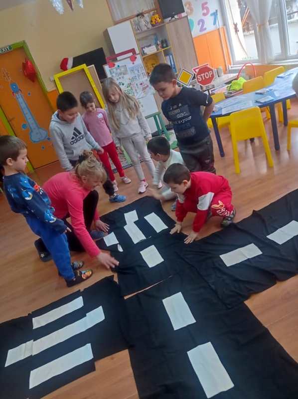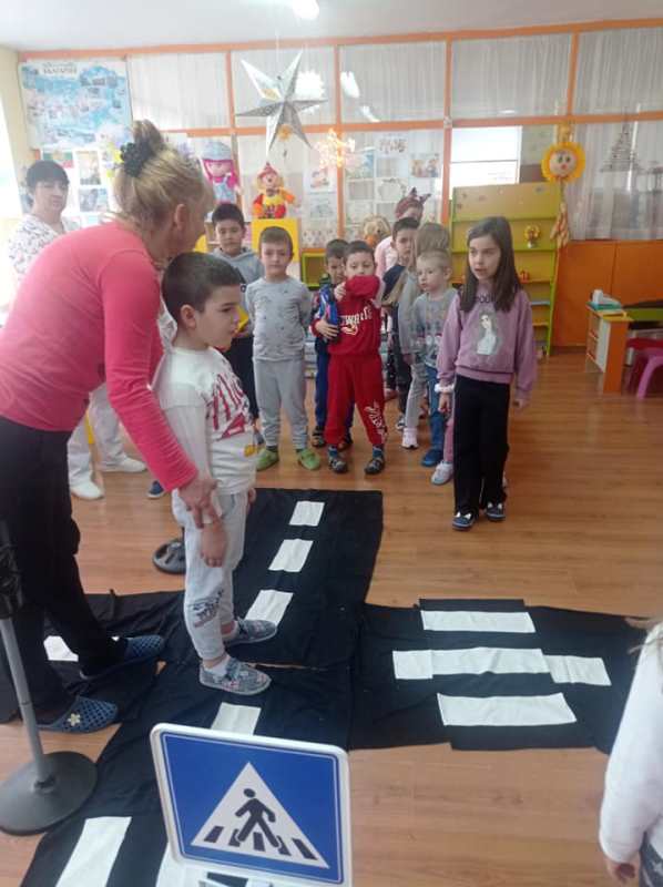 На 07 декември 2023 г. в група „Врабче” се проведе открита педагогическа ситуация по БДП - „На улицата”. Чрез използване на приказния жанр, децата затвърдиха своите знания за безопасно поведение на пътя. Запознаха се с видовете кръстовища и правилата за пресичане чрез обучаващи игри.Получиха информация за „диригента” на пътя – регулировчика и сигналите забранено / разрешено преминаването , които трябва да спазваме.