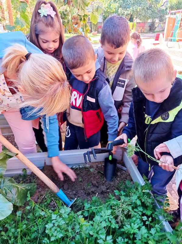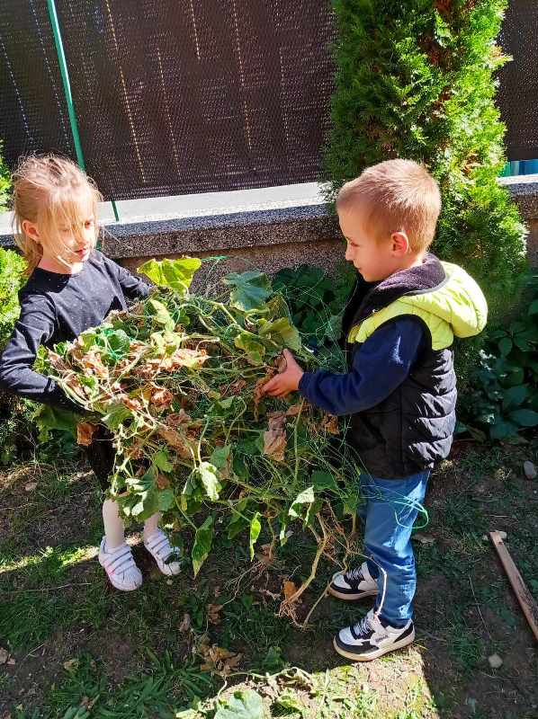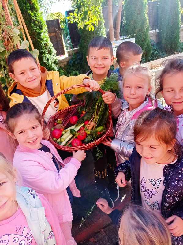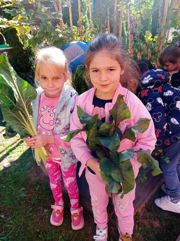 В първия ден на месец октомври 2024 година трудолюбивите деца от група "Врабче" обраха и последните зеленчуци от своята био зеленчукова градинка.