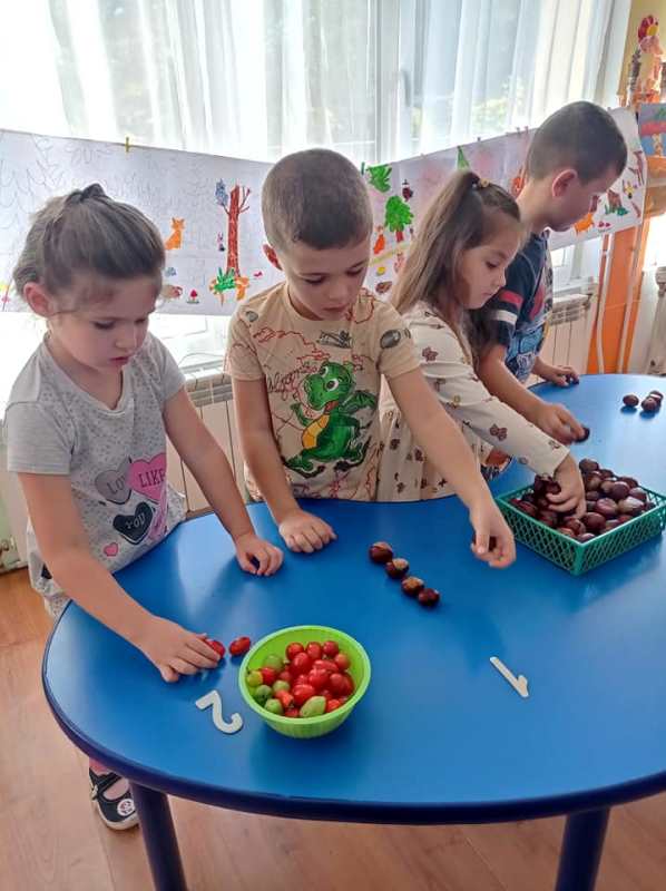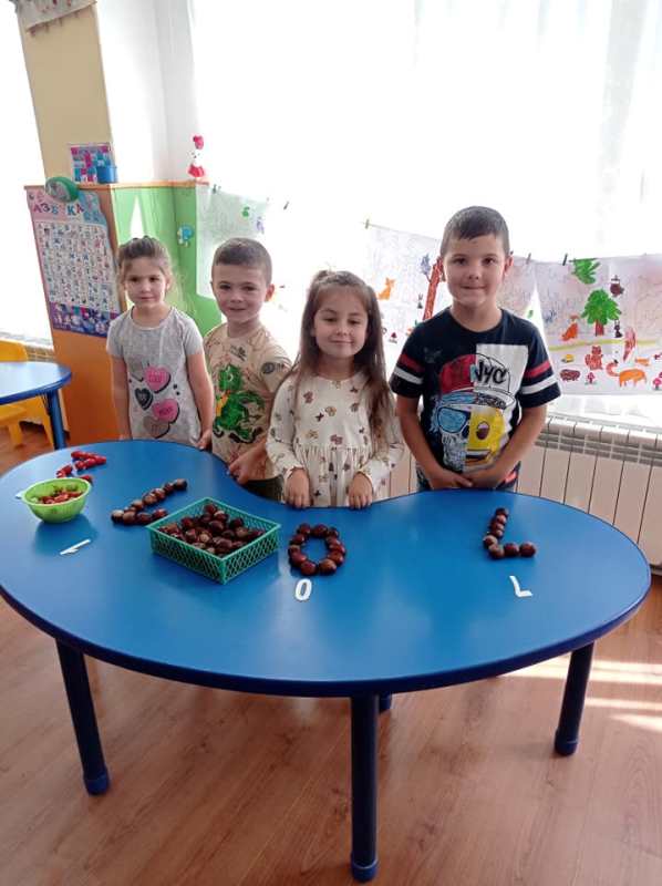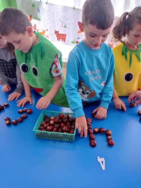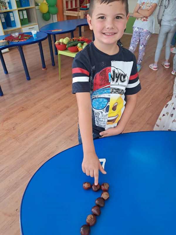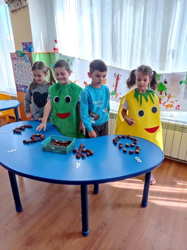 Децата не само нарисуваха с кестени цифрите, но показаха как бързо смятат. Те  вече познават знаците по - малко и по - голямо и с лекота ги поставят между различните комбинации, направени от плодове и зеленчуци.