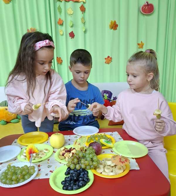 Малките кулинари с радост подреждаха парченцата от любимите плодове в пъстри комбинации.