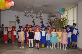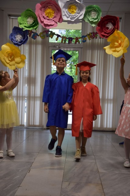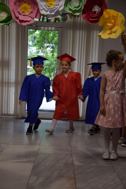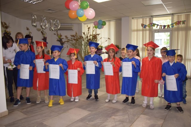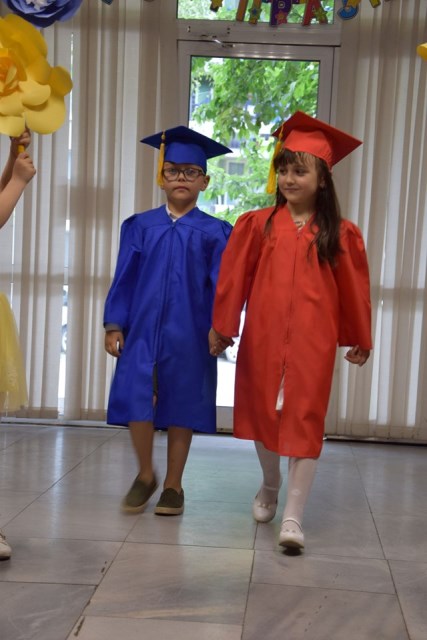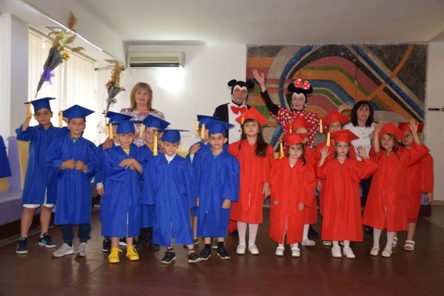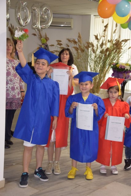 Бъдещите ученици, облечени в тоги - като истински абитуриенти, получиха своите удостоверения за завършена предучилищна степен.