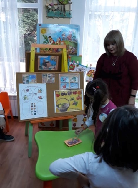 Децата отговаряха изчерпателно на зададените им въпроси, разказваха за плодовете и зеленчуците /как изглеждат, колко са полезни и вкусни/ и как хората се грижат за овощната и зеленчукова градина.