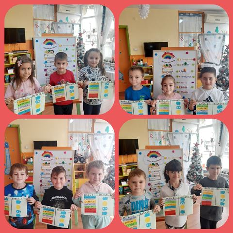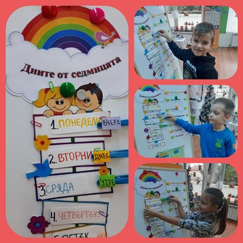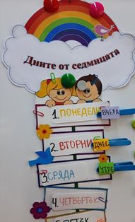 Децата с лекота назоваваха и подреждаха дните от седмицата, упражняваха понятията " днес", "вчера", " утре ", както и понятията за климатично време - слънчево, облачно, дъждовно. Сами си изработиха модел на седмицата, където да отбелязват деня и какво е времето на този ден.