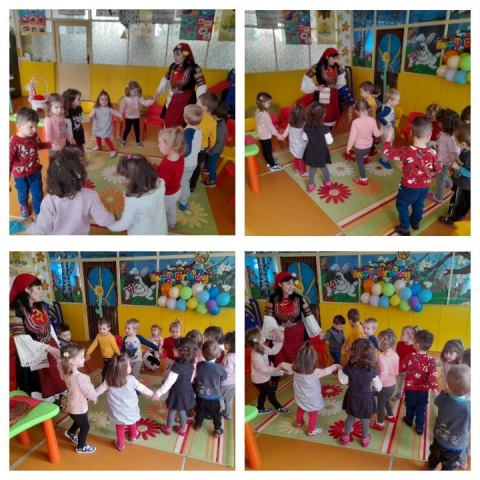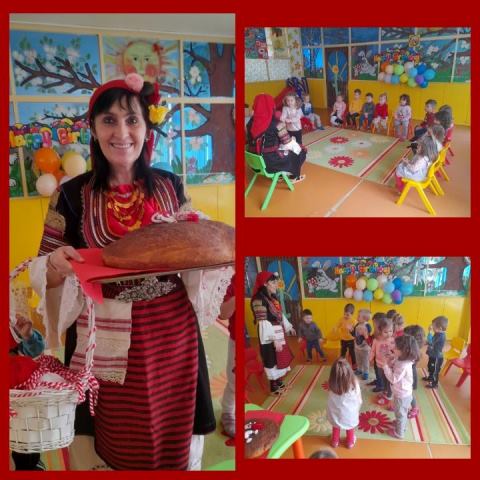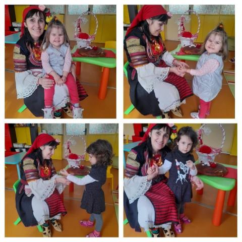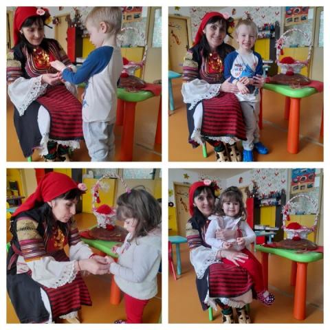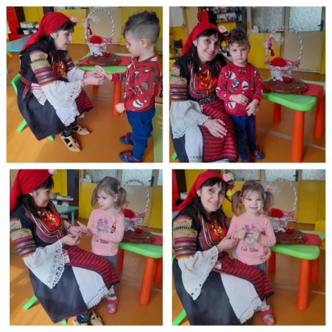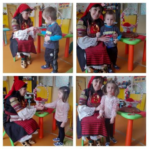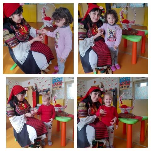 Нетърпеливи малките „Ежковци“ посрещнаха Баба Марта облечена в народна носия, пълна кошница в ръка и питка за здраве. Децата я поздравиха с песни и стихотворения , а тя ги зарадва , като завърза на малките им ръчички мартенички и им пожела да бъдат здрави , бели и червени , като слънцето засмени.