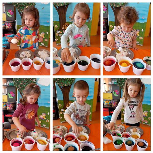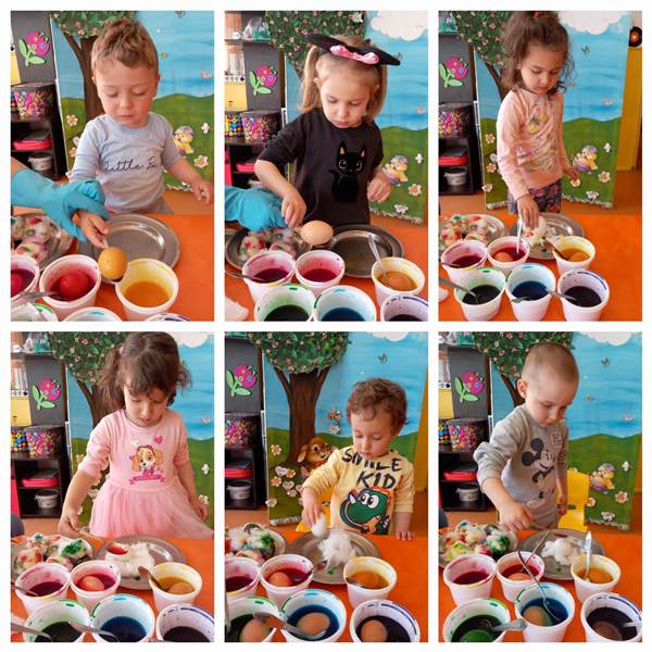 Малчуганите с желание и интерес пробваха различни начини на декориране на яйцата – рисуване с маслен пастел, боядисване с памук върху което накапаха различни цветове боя. Всяко дете само избра цвета и начина на декориране на яйцето и в резултат се получиха красиви шарени яйца, които донесоха много настроение и радост. Готовите разноцветни яйца грейнаха като детски слънца, а децата побързаха да ги поставят в красиви кошнички.