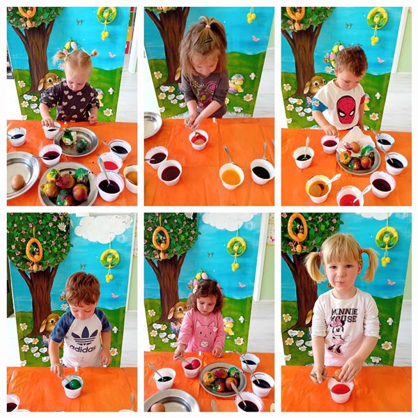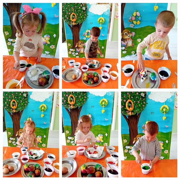 На Велики четвъртък, 3 май 2024 година, най - важният ден от страстната седмица, децата от група "Ежко " спазиха традицията и боядисаха сварени яйца. Най - напред се запознаха с историята, традициите и символиката на празника, а след това запретнаха ръкави и се захванаха за работа. Децата бяха любопитни да научат, че първото яйце трябва винаги да е червено, като с него се прави кръстен знак върху челата им. Децата побързаха да поставят готовите разноцветни яйца в красиви кошнички. Накрая малките "ежковци"с весели великденски песнички пожелаха на всички много здраве, любов и благоденствие.