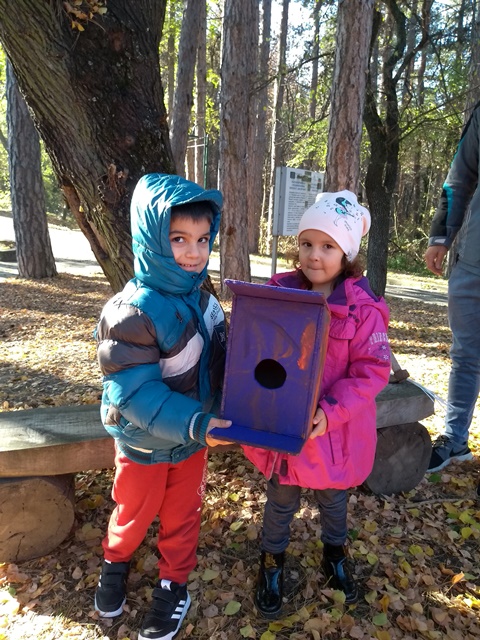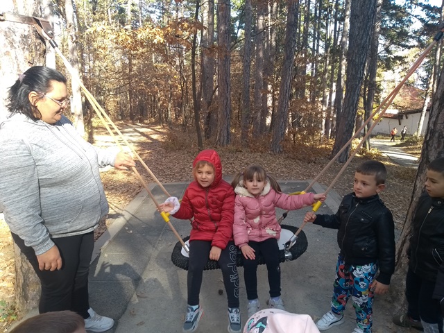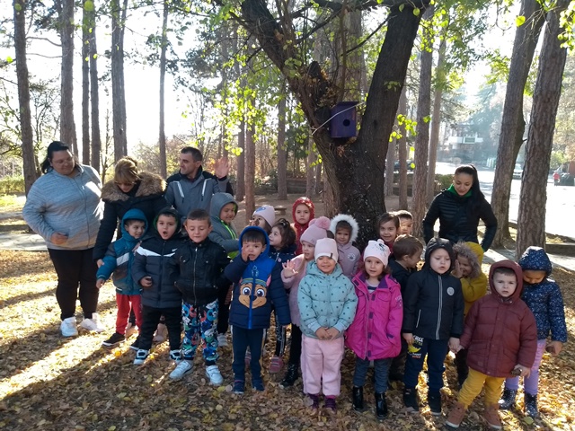 Поясни защо ще поставим къщичка за птици, кой е направил къщичката и правилата за поставянето ѝ. Пътя на разходката ни покрай детската площадка "Баба Яга". Там малчуганите играха на воля и събраха различни природни материали, за да творят в ДГ.