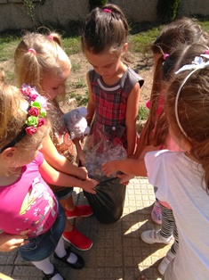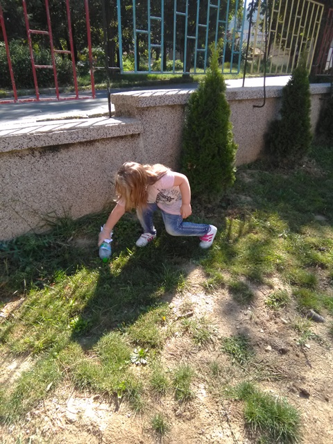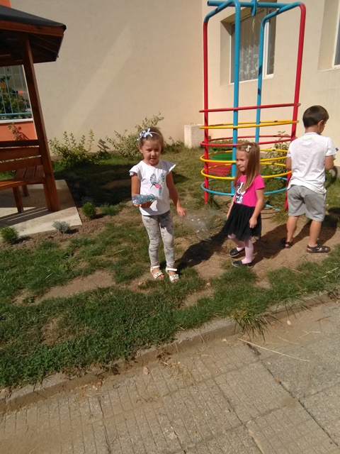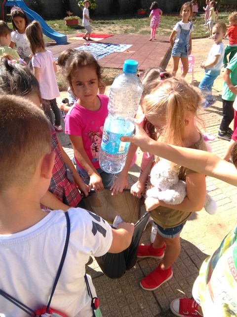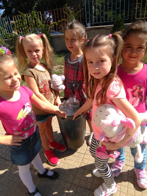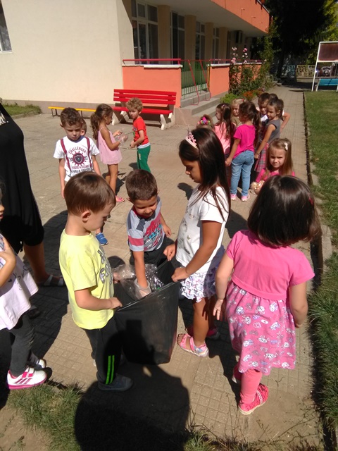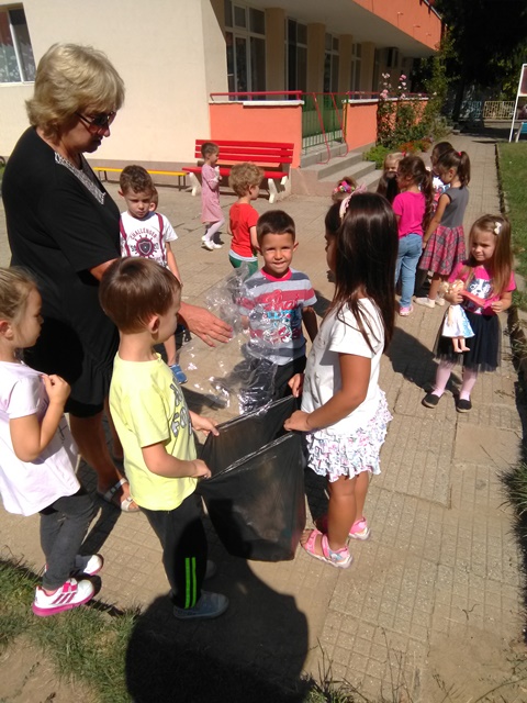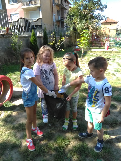 Децата от група „Врабче” и група „Зайче” също участваха в почистването на част от двора и детската си площадка. С интерес изслушаха беседата на госпожа Манова за вредата, която замърсяването нанася на природата ни, колко вредни са отпадъците, колко много години са нужни, за да се разградят и колко важно е да пазим природата чиста.