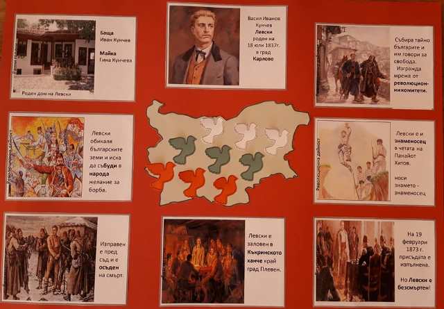С помощта на своите учители изработиха тематично табло, говориха за святото му дело, за неговата смелост и лъвско сърце. Гледаха презентация за живота и подвизите му. Виртуално се пренесоха в родното му място, в манастирите и местата, които е посещавал и където е заловен. Звучаха патриотични песни и стихове за Левски и свободата на България. Оцветиха лика на Апостола.