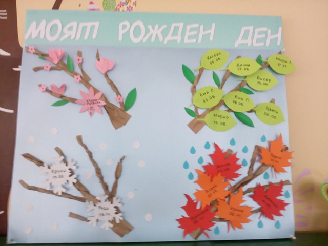 Учителите и децата от група "Звънче" изработиха табло "Моят рожден ден", с което децата лесно и интересно да запомнят през кой сезон са родени. Празнуването на рождените дни в детската градина са едни от най- вълнуващите и емоционални моменти за децата.