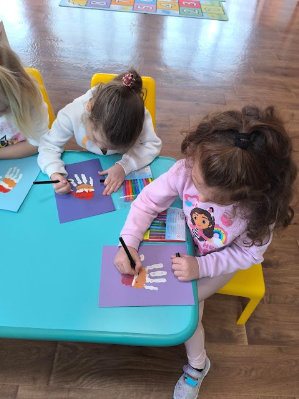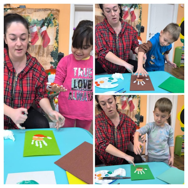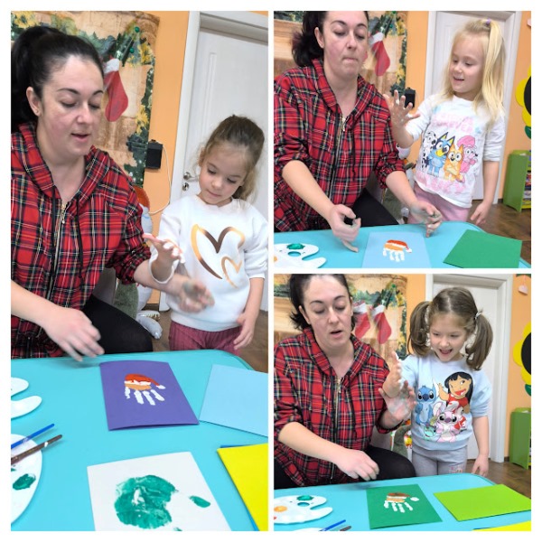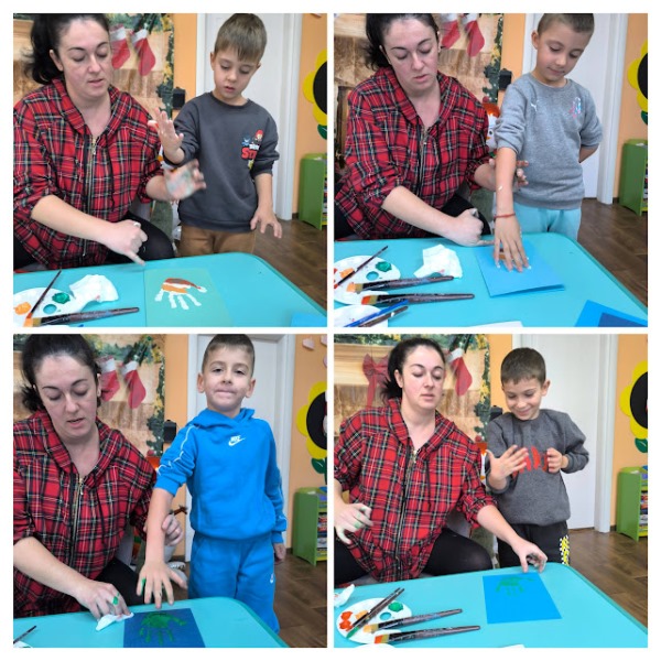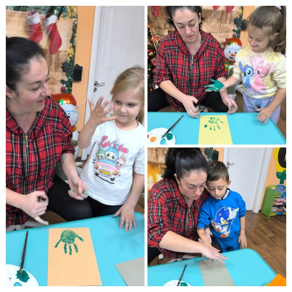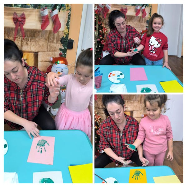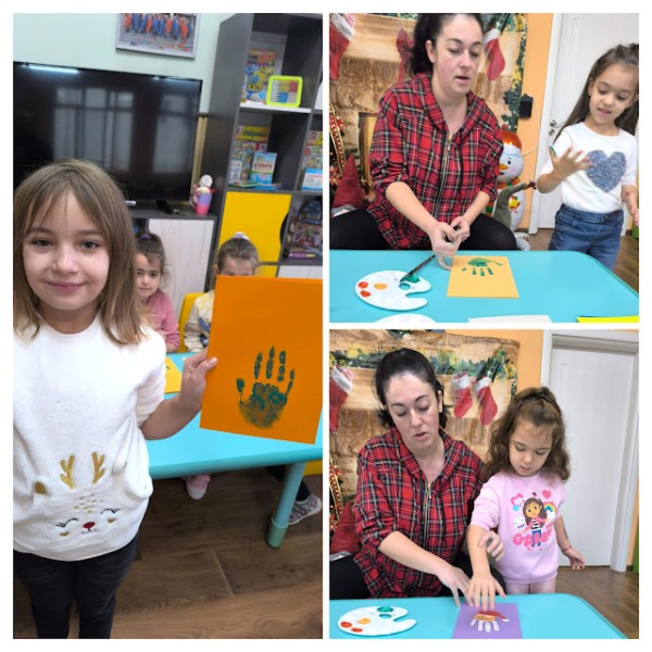 Заедно с децата изработи уникални коледни картички, като използва техника с отпечатъци от ръчички. Малчуганите с вълнение рисуваха дланите си в различни видове бои и създадоха пъстър и весел Дядо Коледа и Коледна елхичка, оформени изцяло от детските отпечатъци. Всяка картичка стана различна и неповторима- истинско произведение на изкуството.