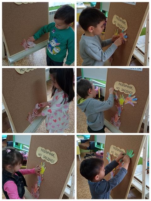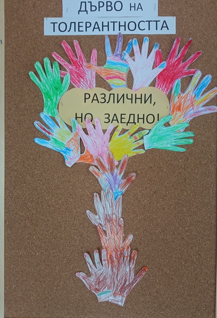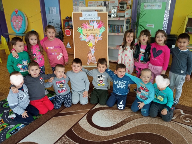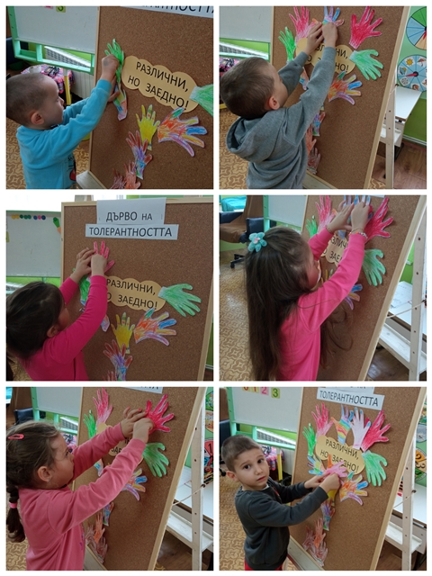 С беседа и презентация на тема: "Бъди приятел!" децата се запознаха с "различните". След това украсиха "дърво на толерантността" от разноцветни ръчички, които те сами направиха.