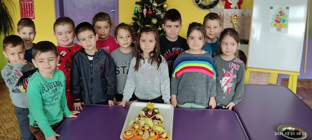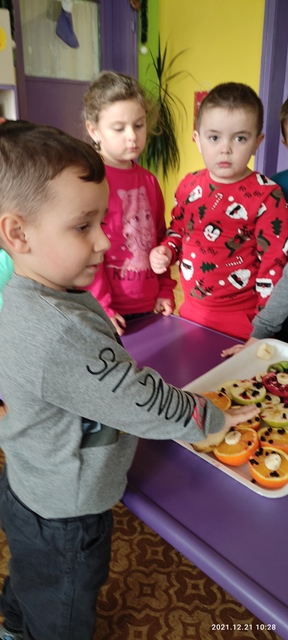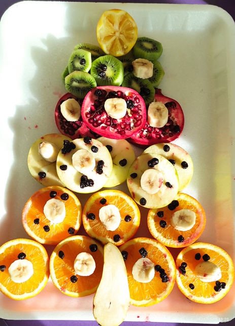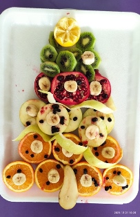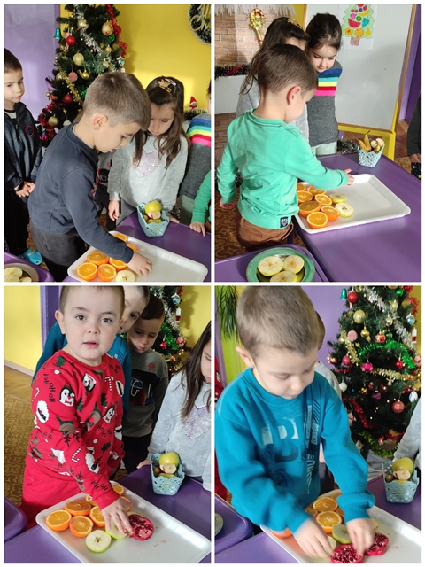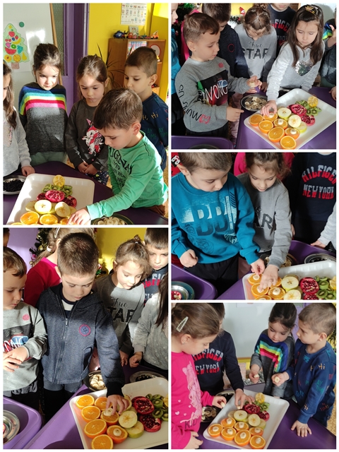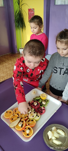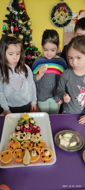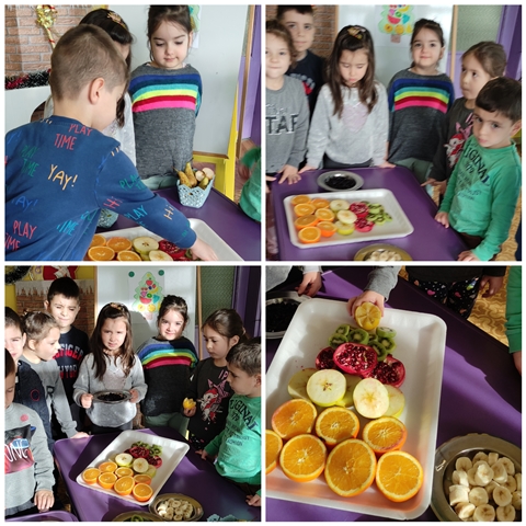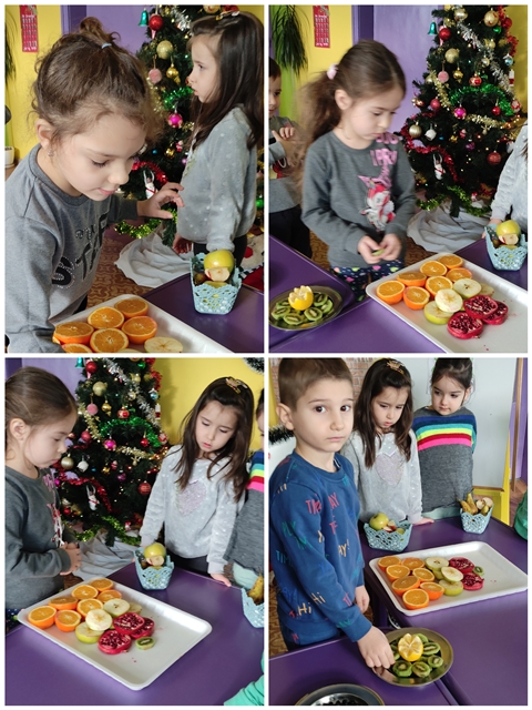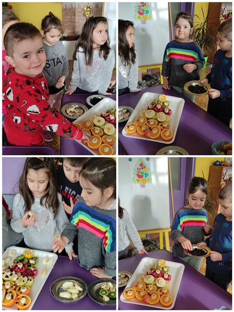 Предизвикателството пред тях бе да направят общ проект на елха от истински пресни плодове, с които разполагаме в детската градина и тези, които децата са донесли.