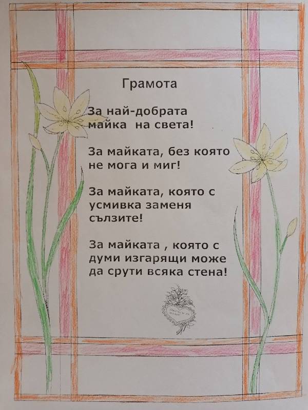 За празника на мама- 8 март, децата от група „ Катеричка“ се постараха, за да изработят подарък - изненада, с който да зарадват своите майки за грижите, любовта и безусловната подкрепа.