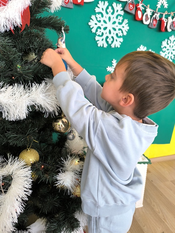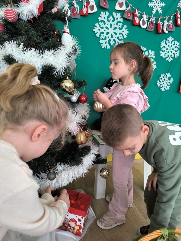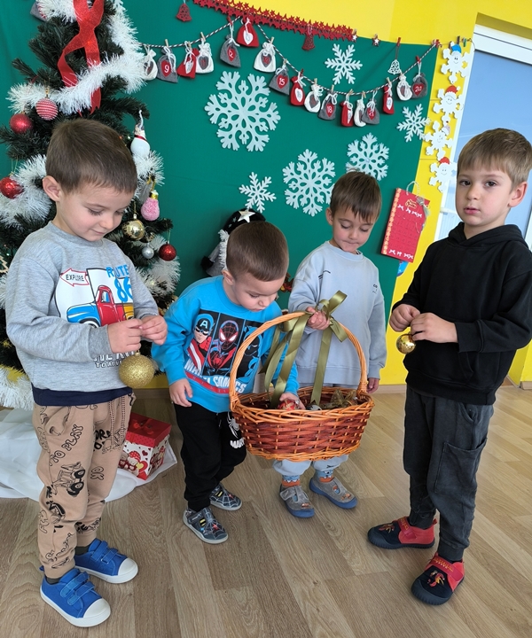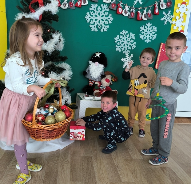 На 3 декември 2025 година в група "Катеричка" настъпи истинска празнична магия. Децата с голямо вълнение се събраха около красивата зелена елха, за да я украсят. Малките ръчички внимателно подреждаха шарени топки, блестящи звезди и коледни фигурки, направени по време на заниманията. Всяко дете избра своето специално място, на което да закачи украса, а смехът и радостните възгласи изпълниха занималнята. Накрая всички заедно поставиха голямата звезда на върха на елхата и я запалиха със светлините.