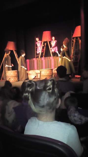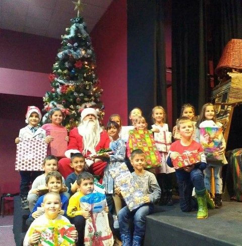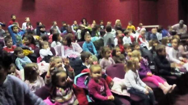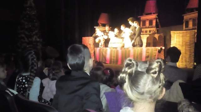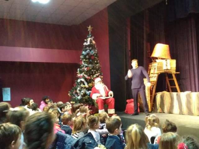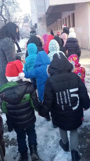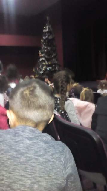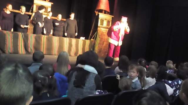 В „уречения час“пристигнахме в Театъра .Посрещнаха ни артистите в празнично украсената зала, с бляскави гирлянди и грейнала елха. Традиционно те представиха за нас пиеса – народната приказка „ Нероден Петко“.Тя не е с коледен характер, но носи добра поука за всички.