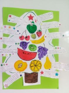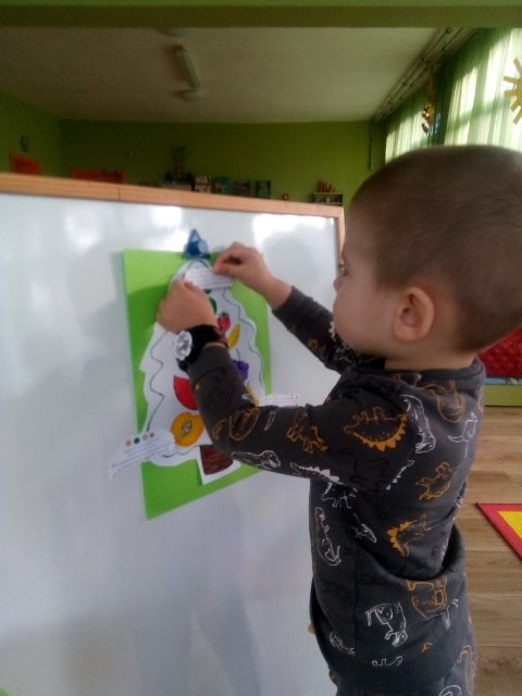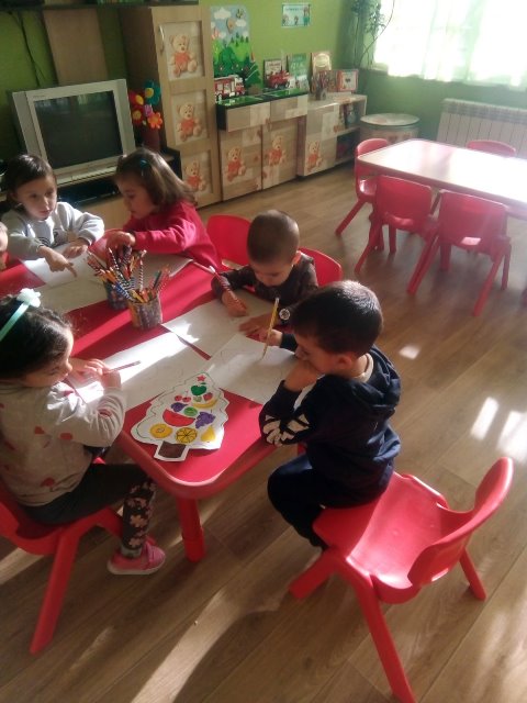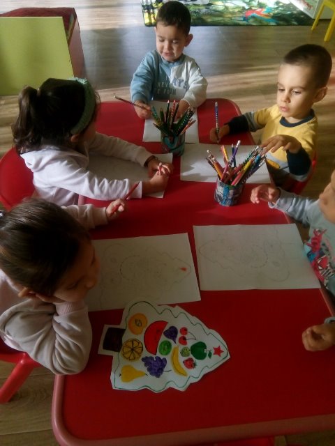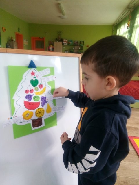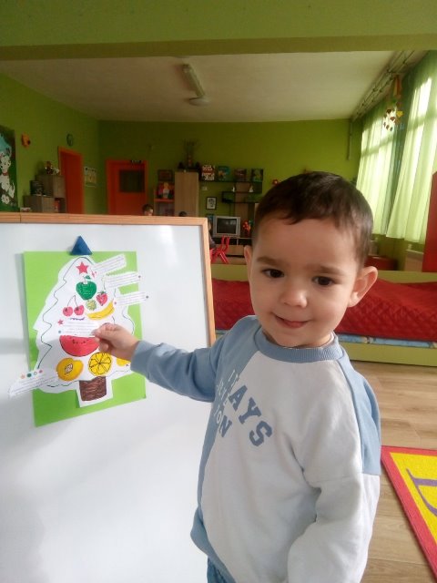 След разказа децата оцветиха специално подготвени рисунки с плодовете и зеленчуците. Много бързо и вярно те свързаха с подходящи новогодишни пожелания всеки един от техните любимци.