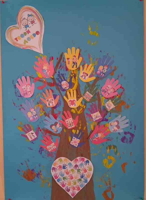 Децата вложиха много любов и старание като използваха отпечатъци от своите ръчички, за да оформят клоните и листата на дървото. Върху всяка ръчичка те поставиха свои малки послания с картинки,които изразяват благодарност към приятел,прегръдка, мил жест към деца в неравностойно положение или нещо, което ги кара да се чувстват щастливи.