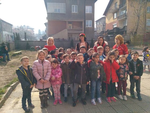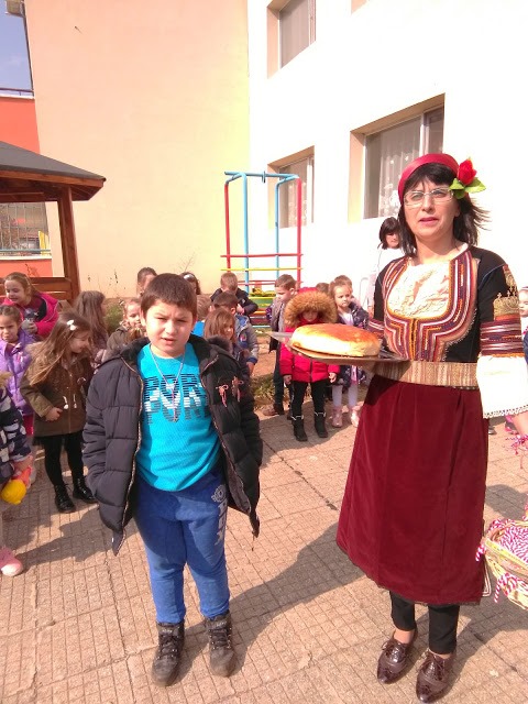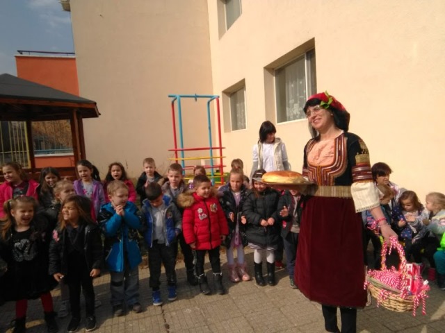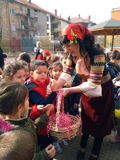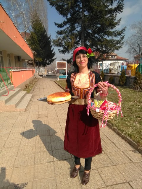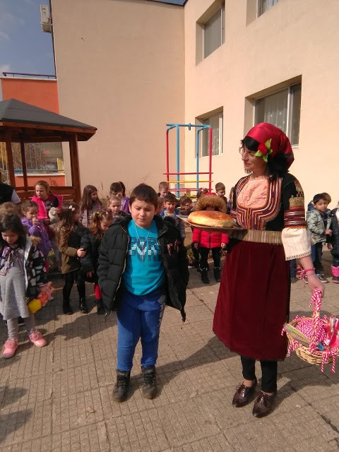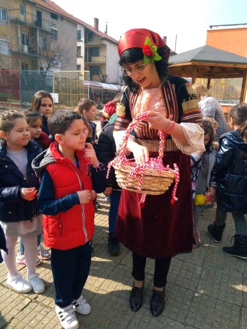 В топлия и слънчев мартенски ден всички деца от ДГ”Еделвайс” излязоха на двора, за да посрещнат толкова очакваната и желана Баба Марта. С настроени и слънчева усмивка пристигна и самата тя – Баба Марта. В ръцете си носеше топла, вкусно ухаеща питка и кошница пълна с пъстри мартеници. Развълнувана от топлото посрещане, Баба Марта разказа на децата за това какво символизират белия и червен конец.