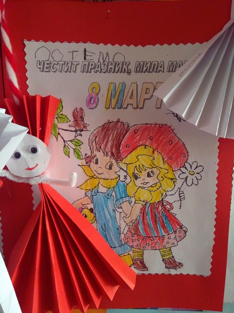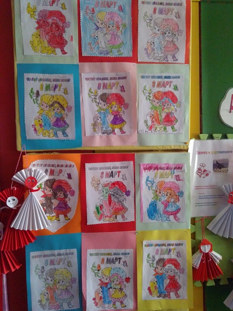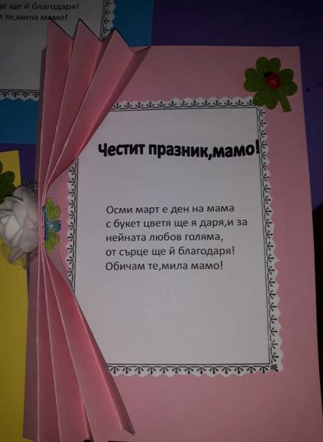 Рисунките, в които децата влагат цялата си любов и старателност остават за дълго време и всяка една майка ги пази. Децата се включиха и в изработването на картичките за празника на мама,която всяко дете подари с думичките "Мамо,обичам те!"