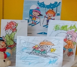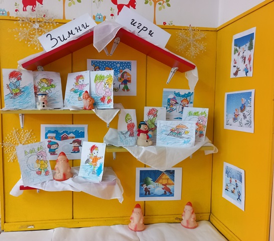 След това подредихме кът със зимни рисунки на децата по темата.И сега с нетърпение очакваме да завали сняг, за да отидем на пързалката.