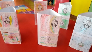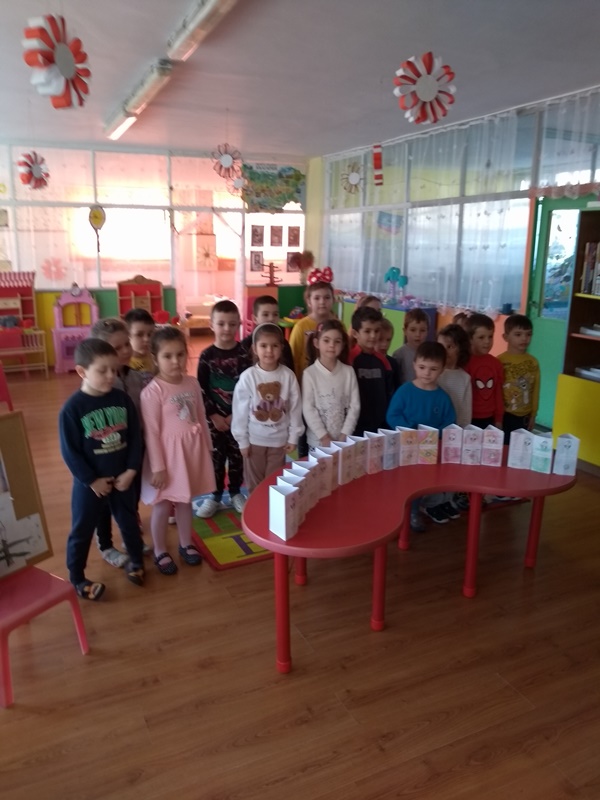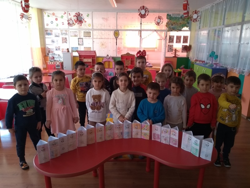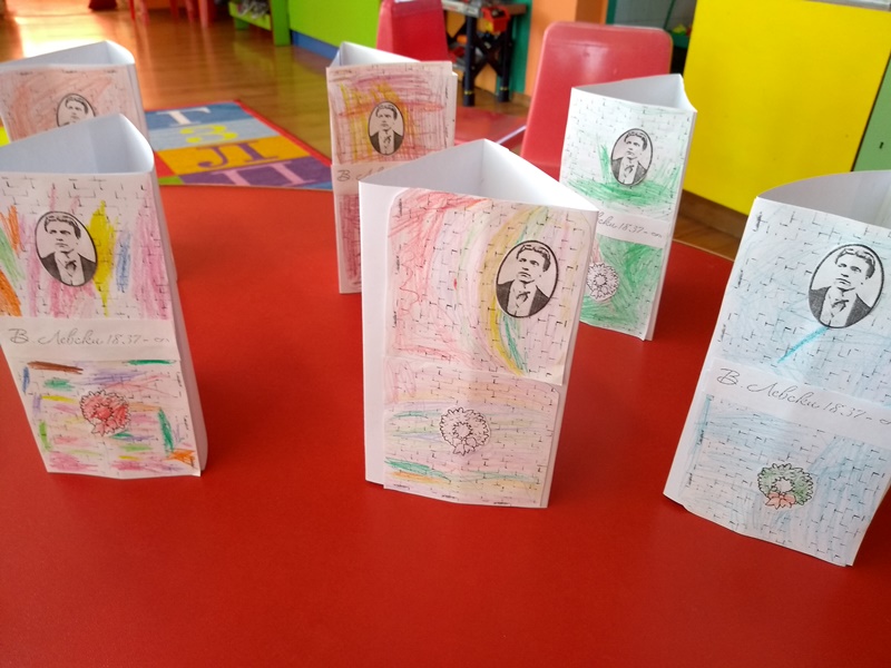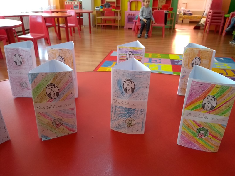 С рецитиране на стихотворението "Завръщането на Васил Левски" и с "Песен за Апостола" започнахме отбелязването на 150 години от гибелта на Васил Левски. Изгледахме анимационен филм за Дякона, четохме и разглеждахме книги с разкази и легенди за героя, с което се провокираха децата от група "Зайче" да покажат отношението и виждането си за Апостола, като оцветят, залепят и подредят в изложба "паметник" за В. Левски.