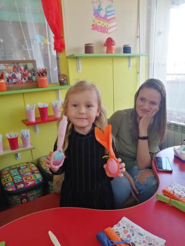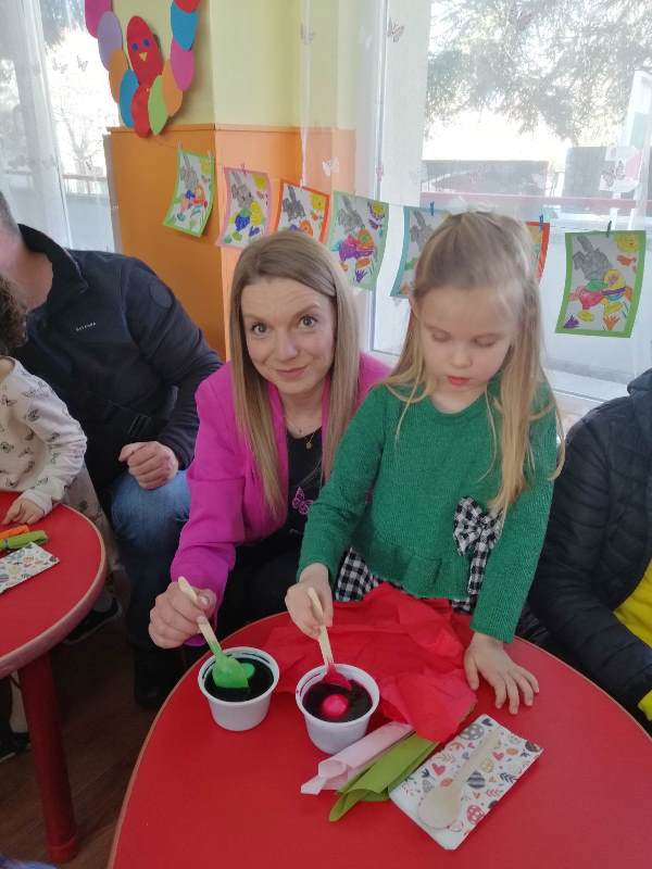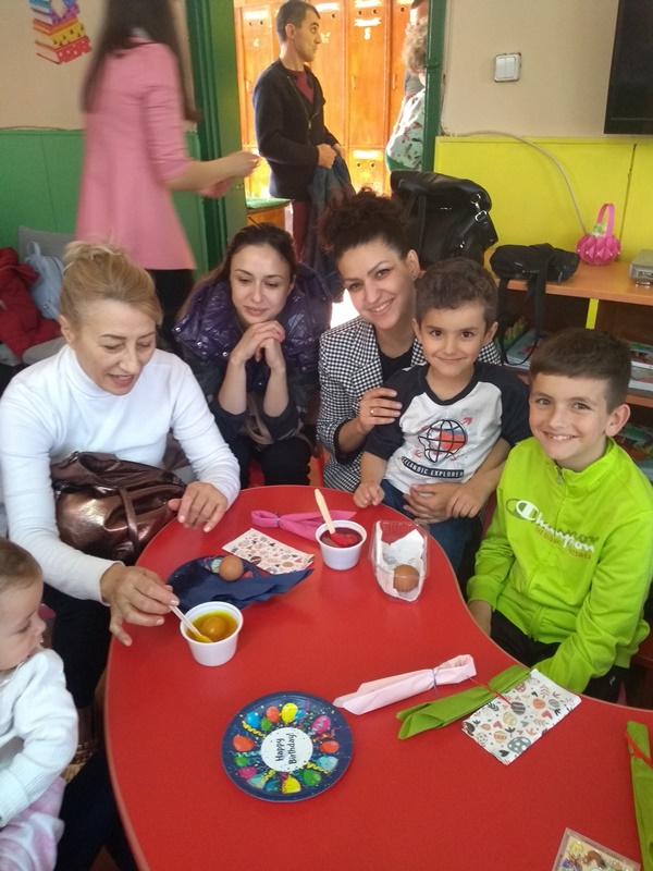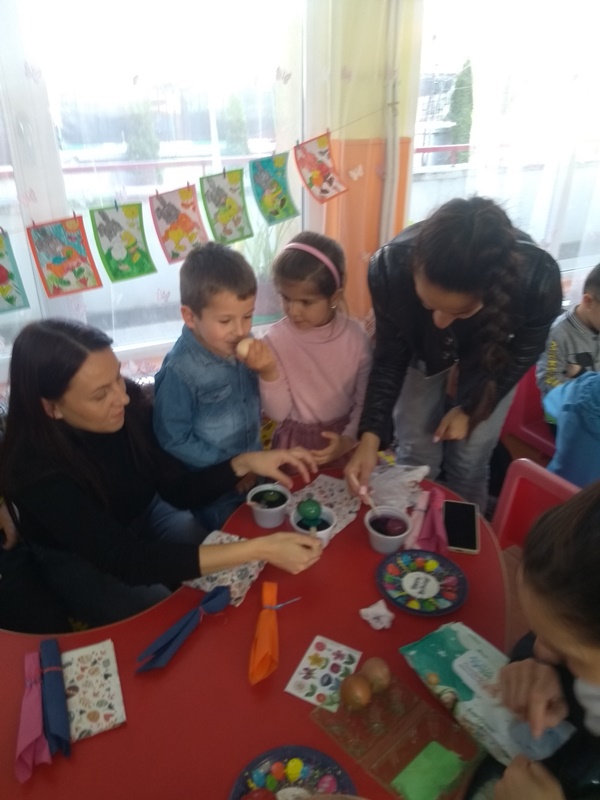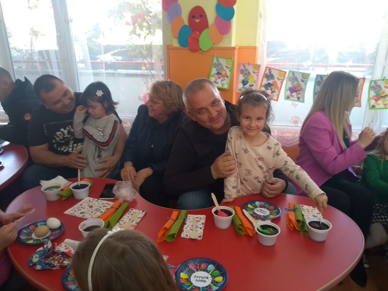 Великденските вълнения продължиха с боядисване на пъстри яйца, където родители и деца развихриха своето въображение и сътвориха уникални неща за предстоящия Великденски базар. Участието на родителите в подготовката на празника е важно за успешното партньорство между семейството и детската градина.