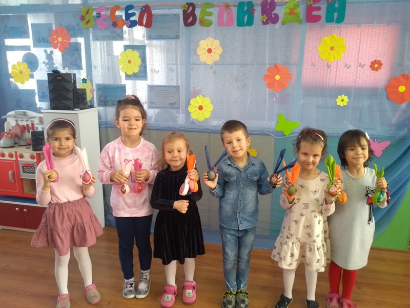 В група "Зайче" се проведе великденско тържество на 12.04.2023 г. пред родители и гости /директора на ДГ "Еделвайс" г-жа М. Атанасова и зам. директора г-жа С. Златанова/.