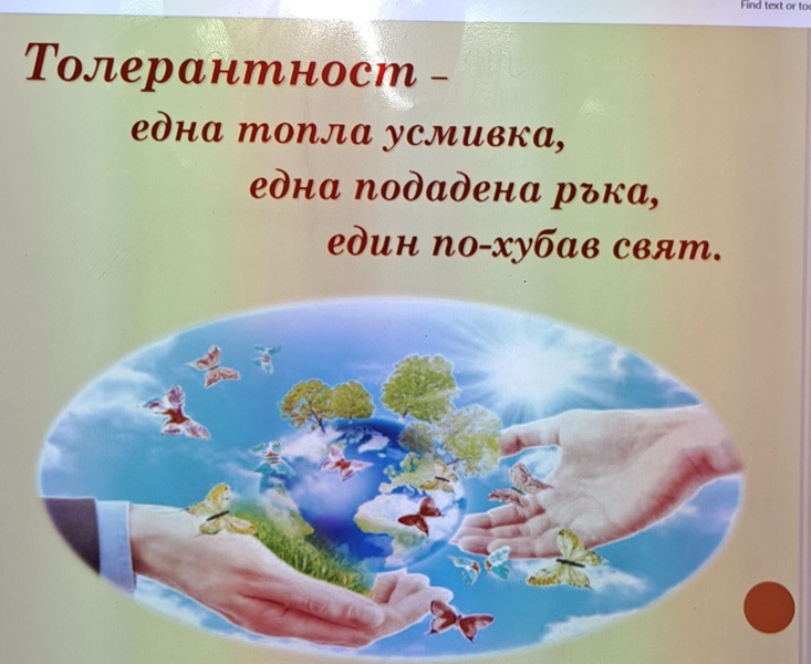 Децата разбраха, че толерантността е уважение, приемане и разбиране на хора от различни култури и проява на търпимост към чуждо мнение, поведение, желания, интереси и цели. Толерантност – това е хармония в многообразието.Толерантност-това е да бъдеш човек!
