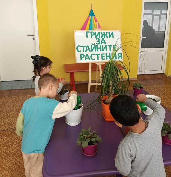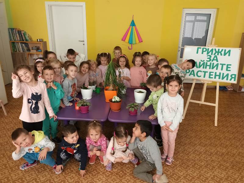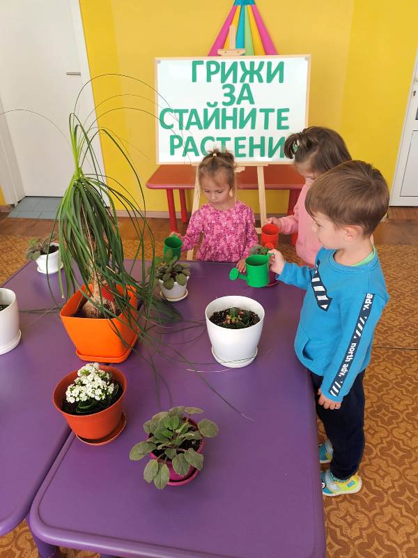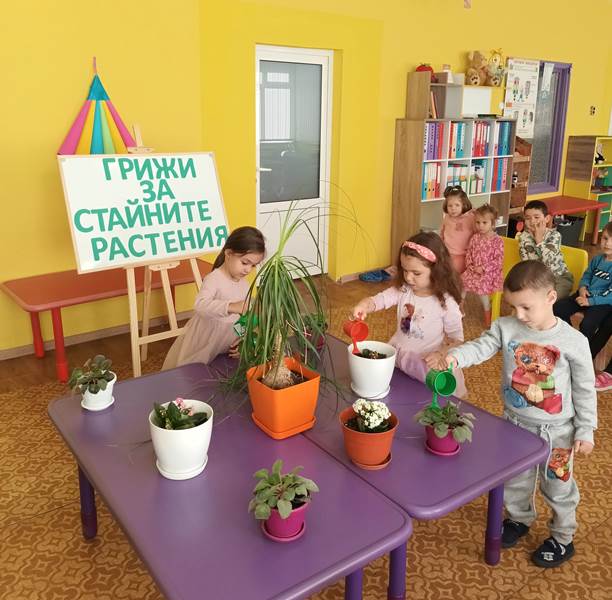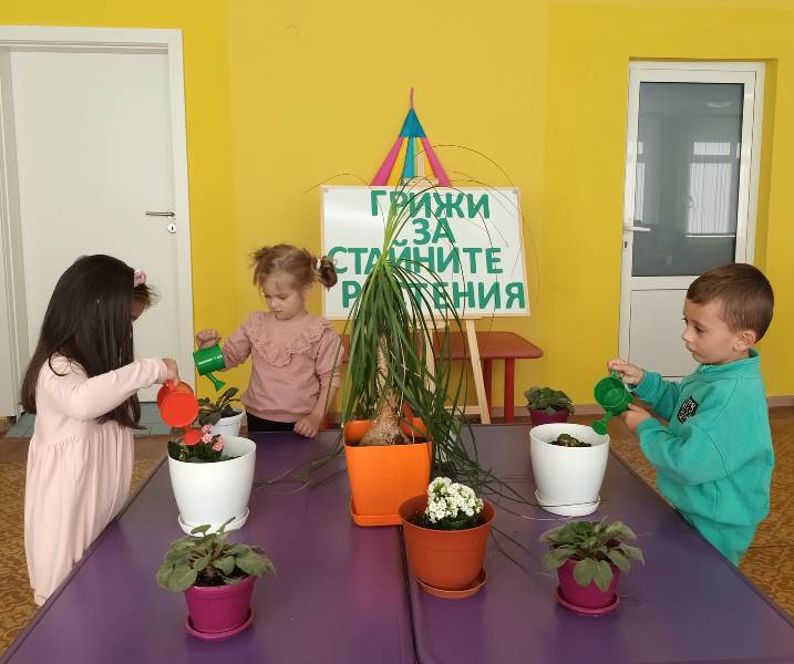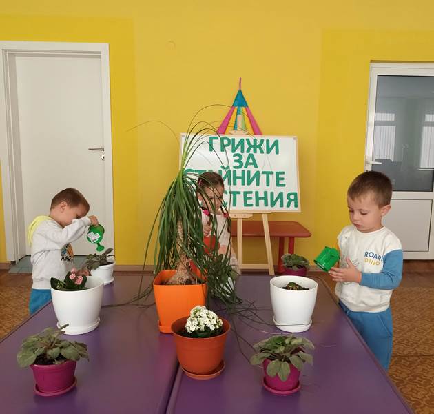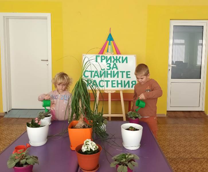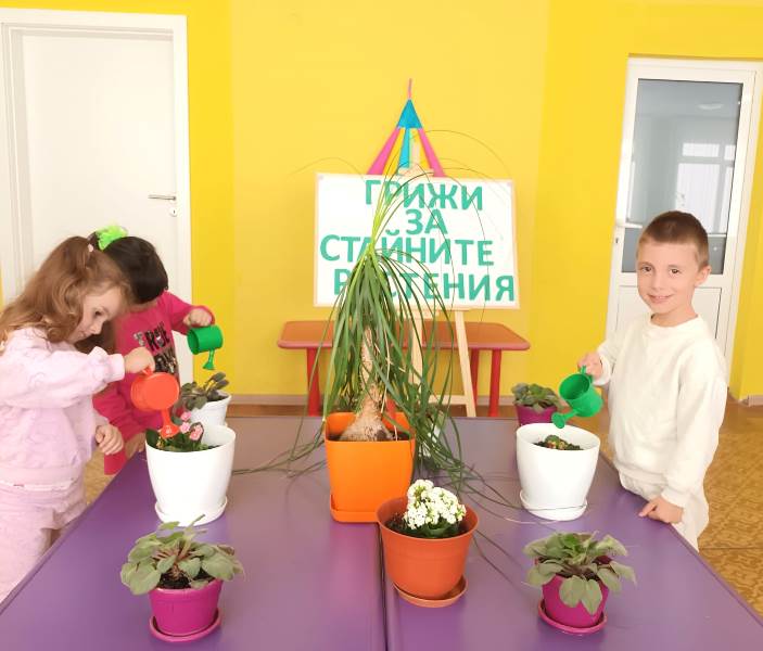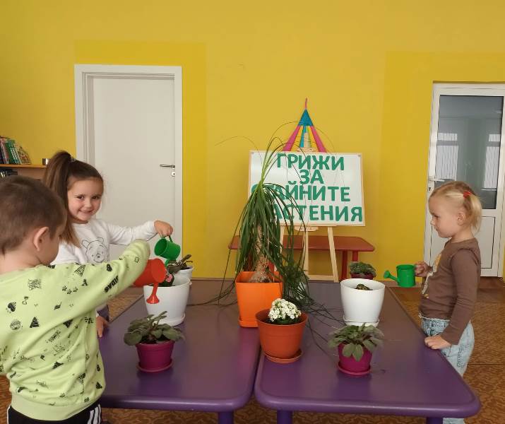 Малките „катерички“ с вълнение се погрижиха за стайните растения в любимата детска градина. Малчуганите научиха, че през есенно-зимния период за стайните растения е много важно да се полагат подходящи грижи, за да не загинат. Разбраха основните правила, които трябва да полагаме за тях. Стайните растения се нуждаят от светлина, добра влажност, хранителни вещества и топлина.