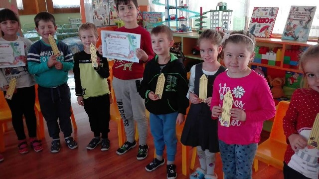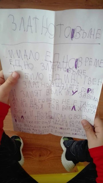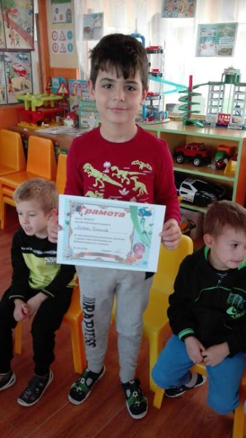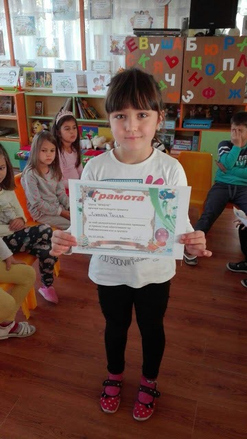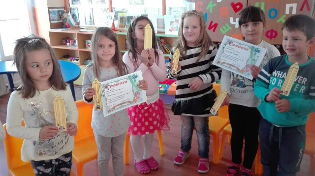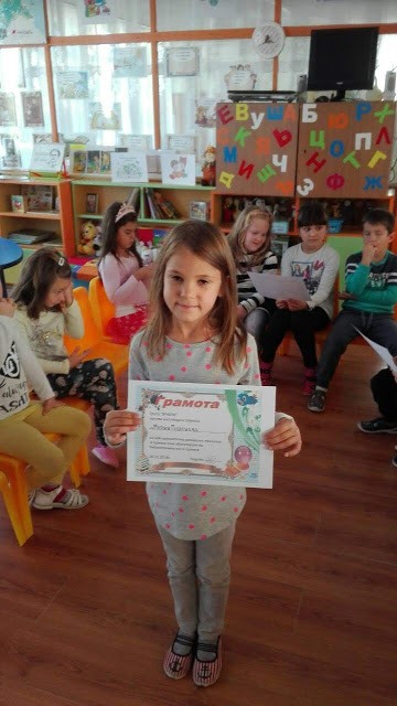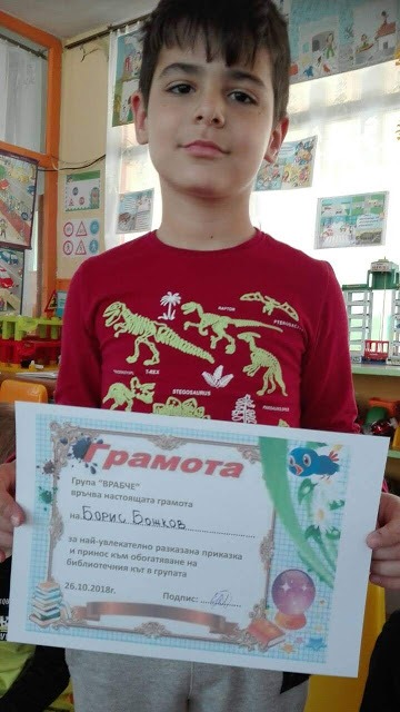 Голямо бе желанието на всички деца да се включат в разказването на приказки. С много емоция и старание те ни припомниха откъси от приказките „Момче и вятър”, „Тримата братя и златната ябълка”, „Златка,златното момиче” и др. Симона, Борис и Мария получиха и своите грамоти за най-увлекателно разказана приказка. Много приятно ни изненада Борис с приказката „Златното вълче”, която той сам е съчинил и написал. За своето желание и старание да разказват приказки всички деца получиха за награда книгоразделител.