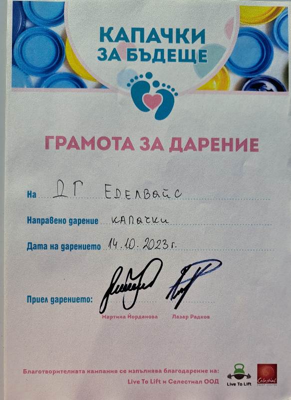 Нa 14 октомври 2023 г., децата от групите "Врабче","Звънче"и "Щурче" участваха в кампанията "Капачки за бъдеще".