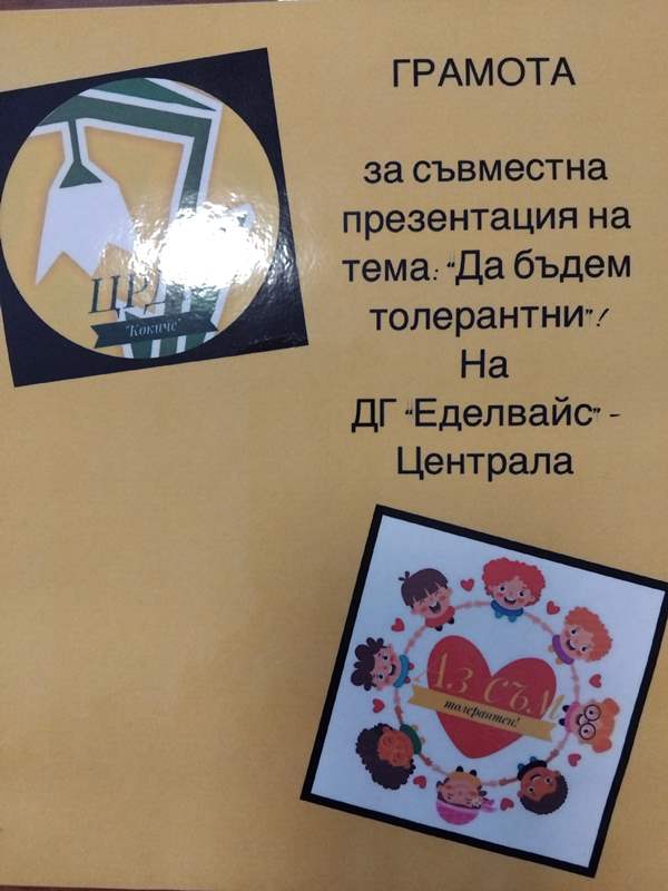 На 14 ноември 2024 година екипът на ЦРДУ „Кокиче“, град Кюстендил гостува на децата от всички на ДГ „Еделвайс“ („Мечо“, „Катеричка“, „Звънче“, "Врабче", "Зайче", "Ежко" и "Щурче") . Представена бе  презентация на тема: „Да бъдем толерантни“.