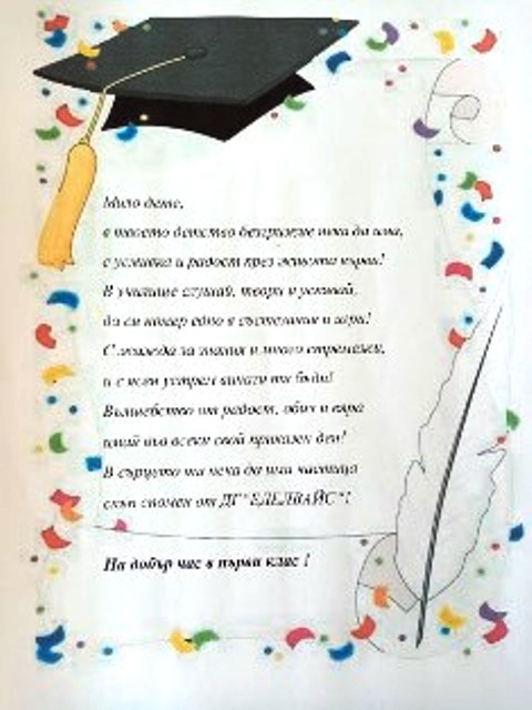 тук в детската градина вие направихте първата стъпка по дългия път на знанието. Сега ви остава да продължите напред и нагоре.