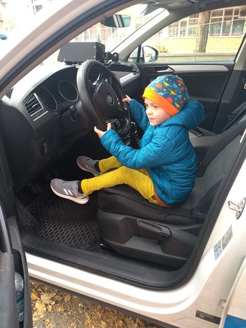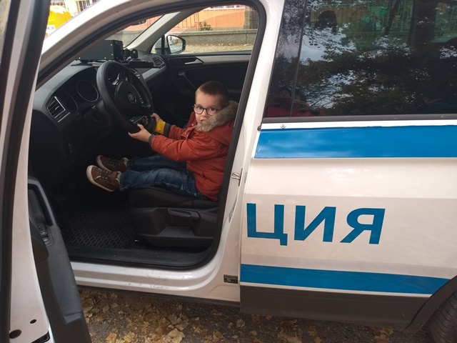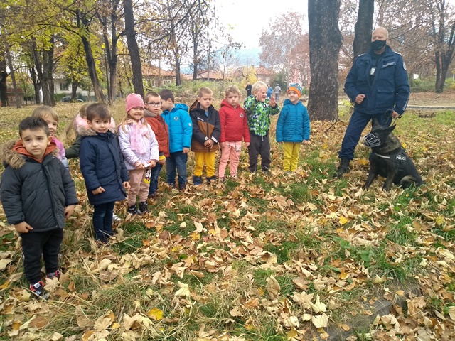 Пред сградата на ДГ"Еделвайс", днес 18.11.2020 г., дойдоха полицаи с полицейски коли. Малчуганите изпаднаха в еуфория, след като се запознаха с таткото на Алек, неговите колеги и полицейското куче.