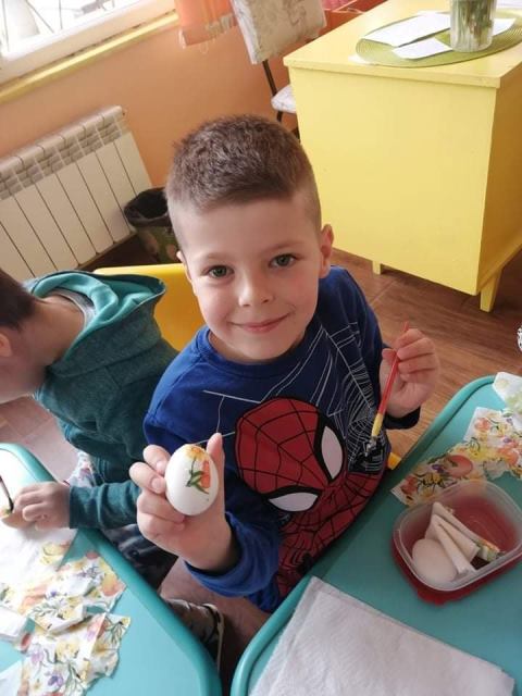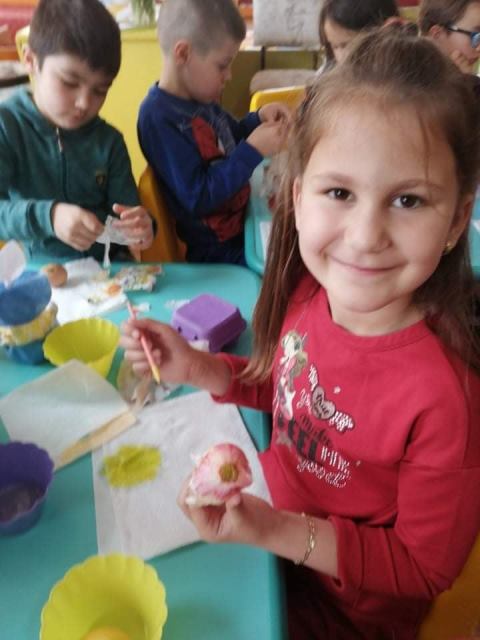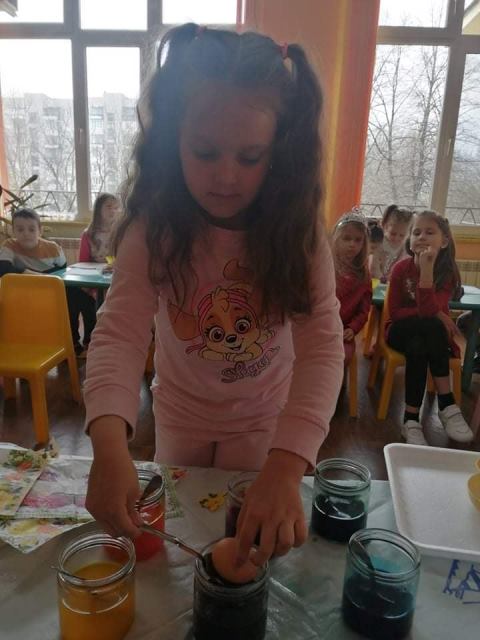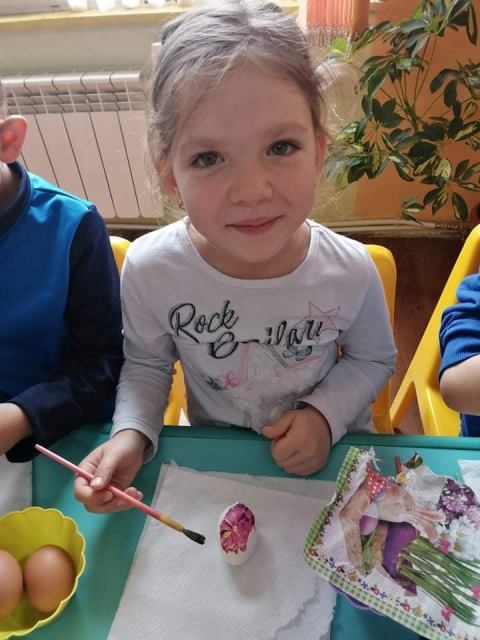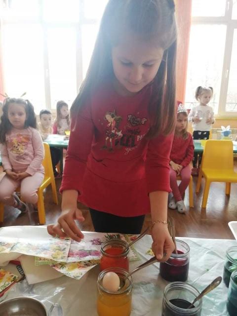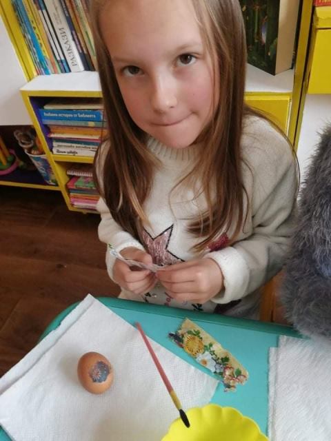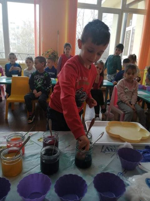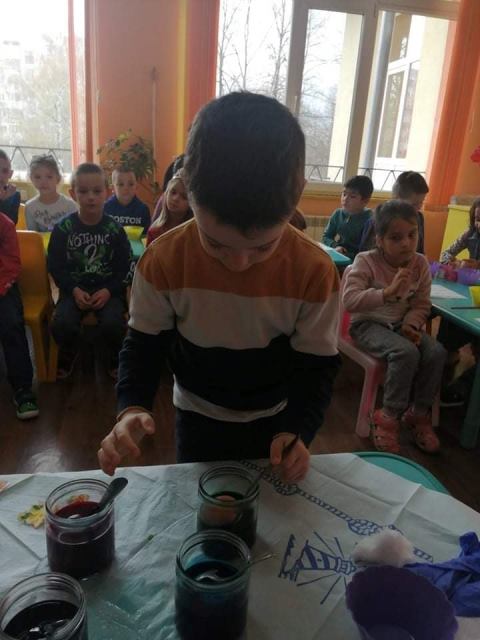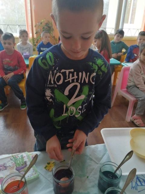 На Велики четвъртък - 21 април 2022 година, децата от група „Звънче“ по традиция боядисаха своите великденски яйца. Всички с голям ентусиазъм се включиха и оцветиха пъстри, шарени яйца. Научиха се да използват техниката „декупаж“, като за залепване на салфетките с великденски мотиви работиха с четка и разбит белтък. По този начин сътвориха истински красоти.