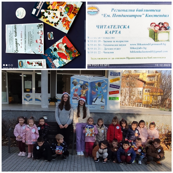 На 12 декември 2023г., група "Катеричка" посети Детския отдел на Регионална библиотека "Емануил Попдимитров" и се включи в инициативата под наслов "Коледно четене на приказки", организирана от Ученически съвет на ПМГ "Проф. Емануил Иванов" и реализирана с любезното съдействието на Регионална библиотека "Ем. Попдимитров".
