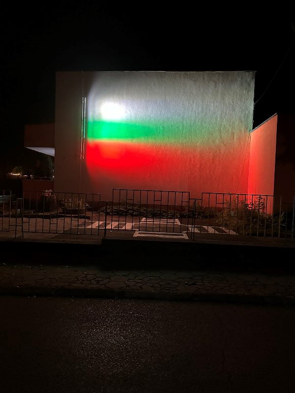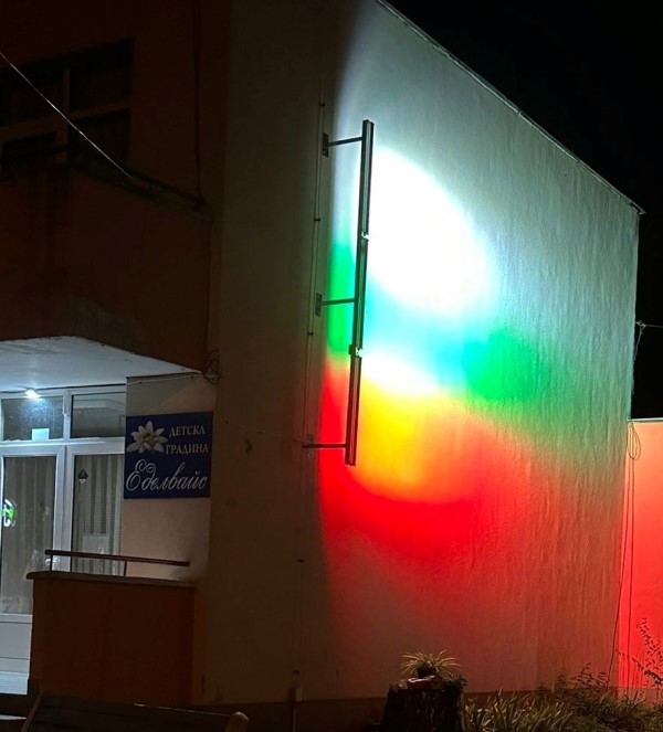 Ето как представяме нашия трибагреник вечер на фасадата на сградата на детската градина: