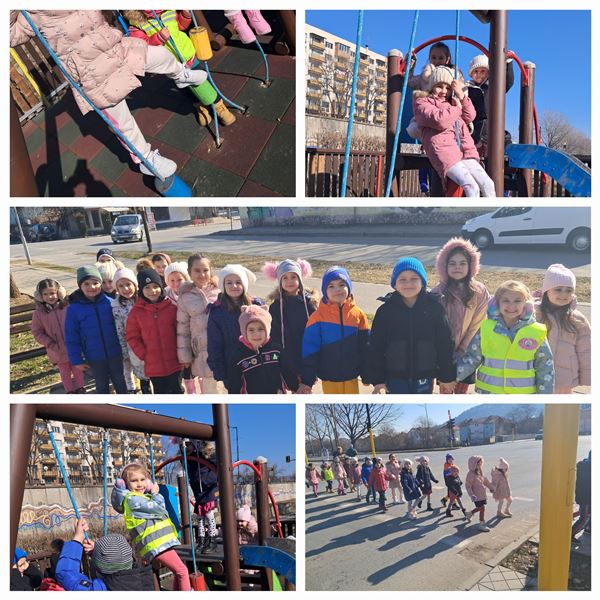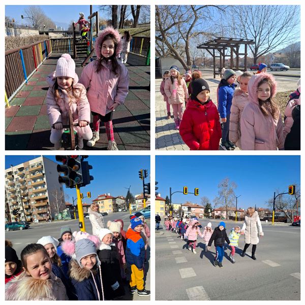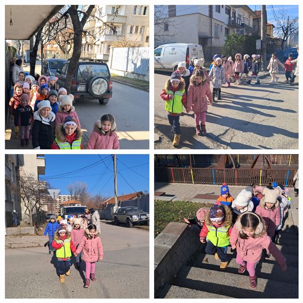 На 11 февруари 2025 г., децата от група „Врабче” се пренесоха в страната на математиката. Посредством разходката до близки до детската градина кръстовища и детската площадка по лесен и интересен начин, определяха местоположението на обектите спрямо тях. Вече знаят и разстоянията до светофара, тротоара и пътния знак. Припомниха си и правилата за безопасно движение.