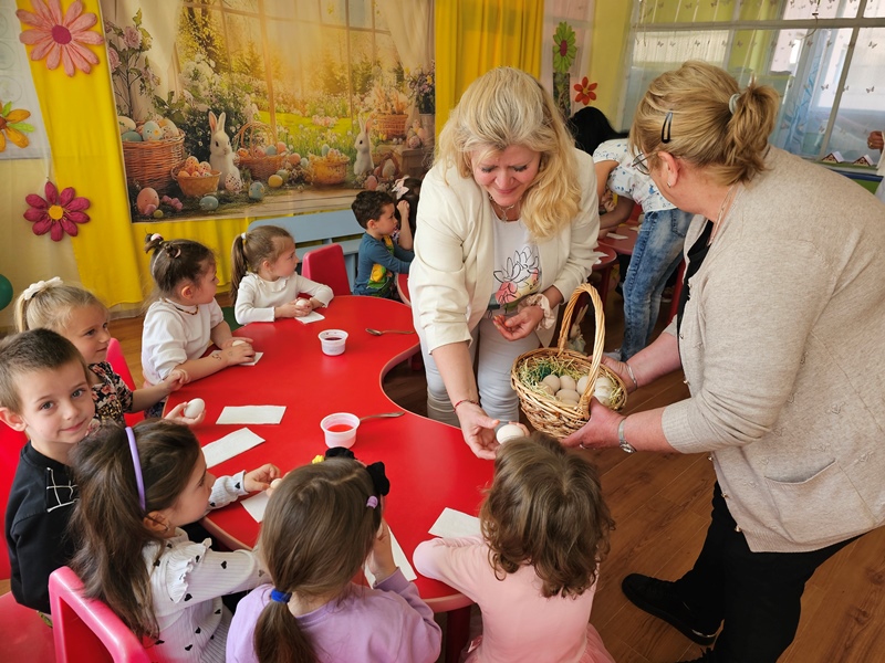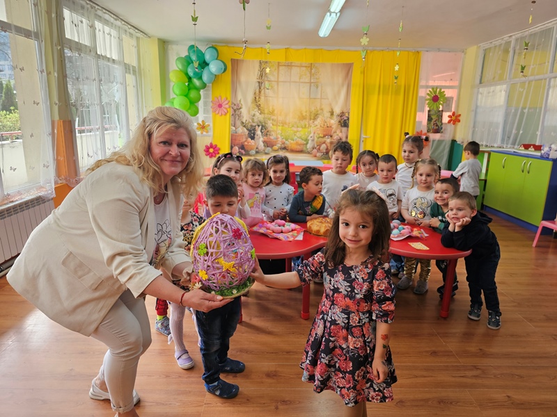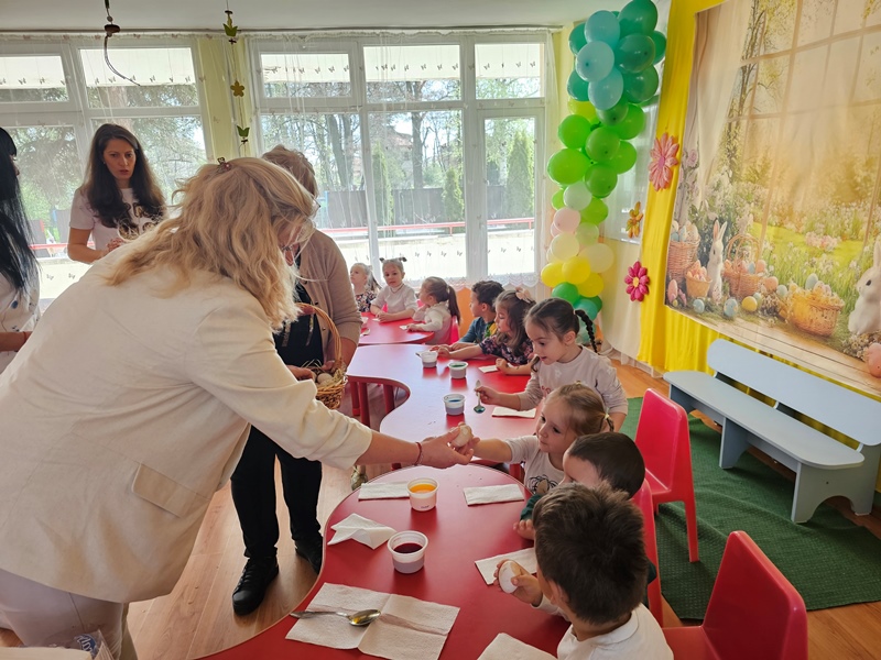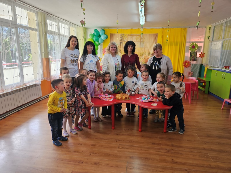 Децата посрещнаха гостите си с празнична програма от тематични песни и стихчета, след което по традиция боядисаха сварени яйца с помощта на своите гости и учители. Готовите разноцветни яйца бяха подредени красиво, за да се украси занималнята за предстоящото Великденско тържество на гр. "Зайче".