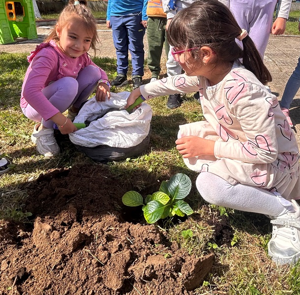 Децата от група „Звънче“ се включиха в инициативата, като оцветиха картини с послания по темата и засадиха храст в двора на детската градина. Засаждането на храсти, цветя, дървета е един от най-ефективните начини за възстановяване на природата и борба с изменението на климата.