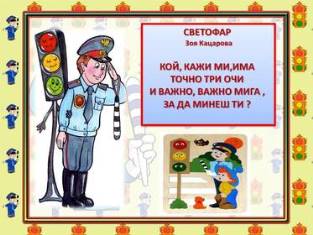 ите на полицая за значението на цветовете на светофара,за мястото за пресичане на уличното платно и др.