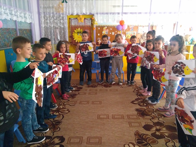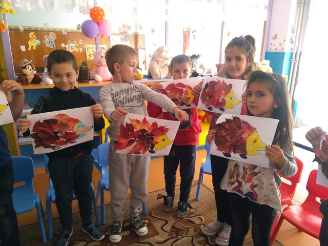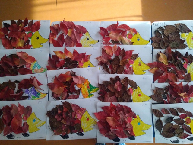 Децата от гр. "Щурче" много обичат есента и работата с природни материали,а такива изобщо не липсват през този сезон.Любимо занимание им е да творят с есенни листа.По време на игра на двора ,те с ентусиазъм събраха купчинки с листа,които подредиха разпръснато в занималнята да се изсушат.На следващия ден със сръчните си ръчички изработиха чудесни апликации на таралежчета,които подредиха в красива изложба .