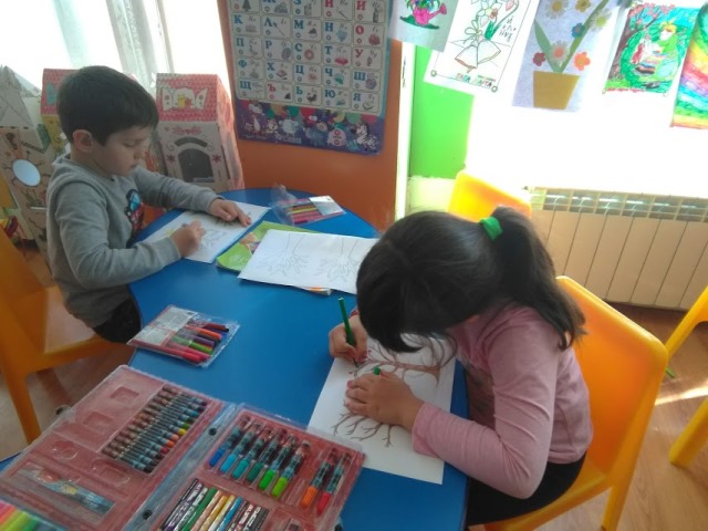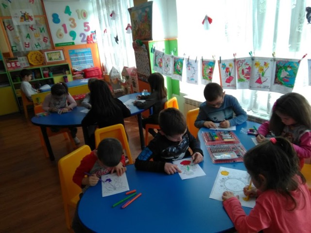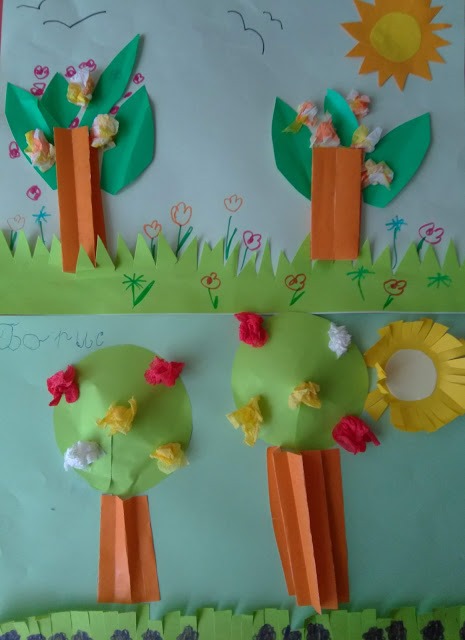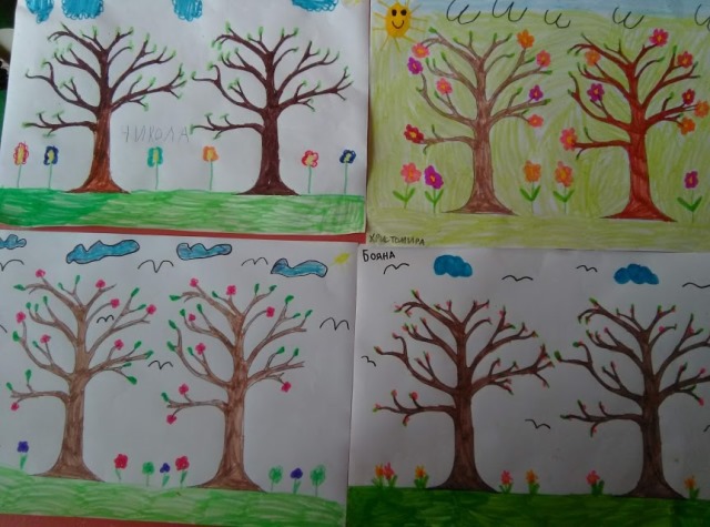 Децата истински се забавляваха и сътвориха чудесни картини на цъфтящи ябълкови дървета - символ на пролетта и началото на нов живот. От цветен картон и салфетки те изработиха великолепни пролетни картини като съчетаха апликиране и рисуване с пастел и флумастри. С разноцветни хартии и памучни тампони децата сътвориха „Пролетни цветя във ваза” . Много интересна бе техниката за направа на пролетни цветя с моделин.