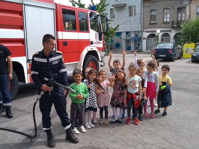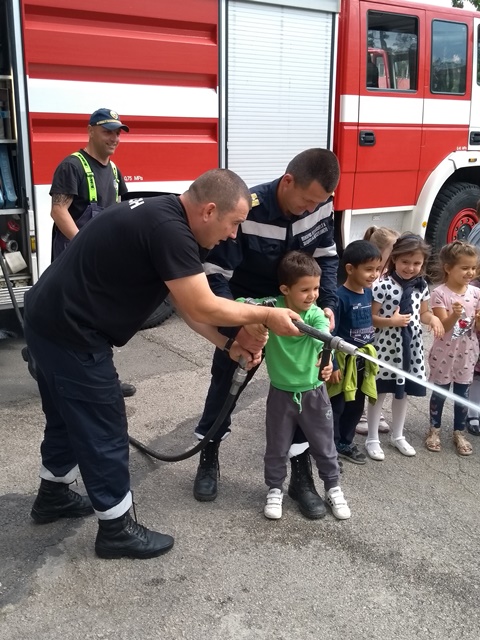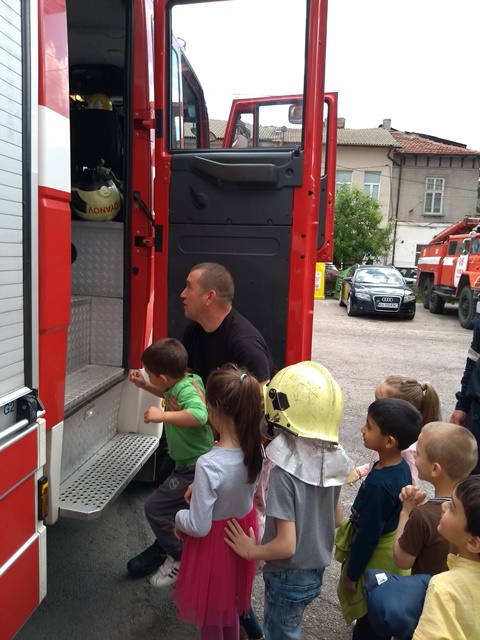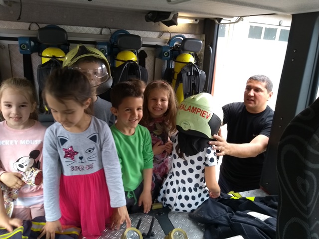 Най-емоционалния момент настъпи, когато децата се превърнаха в малки огнеборци. Всички се качиха заедно в пожарната кола и я разгледаха подробно с любезното съдействие на пожарникарите. Всеки един от група "Зайче" изстреля силна струя от пожарникарския шанг и чу различните звукови сигнали на пожарната кола.