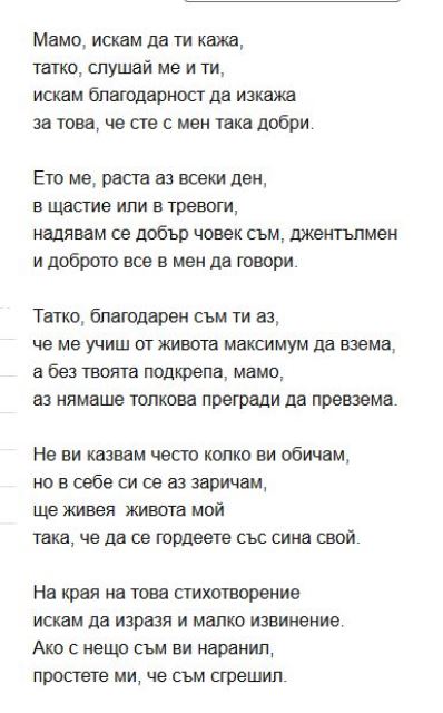 Нека поздравим мама и тати със стихче, като им благодарим за грижите.