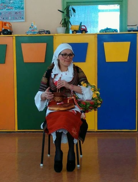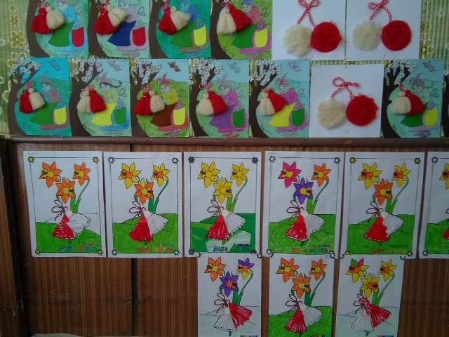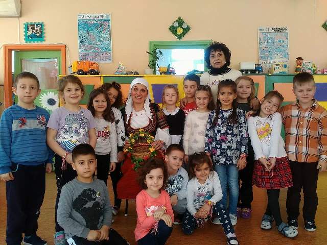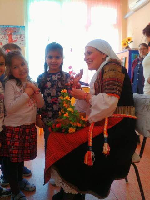 Програмата започна с пролетна песен и ето,че Любимата Баба се появи с питка в ръце и кошница, пълна с мартеници. Поздрави децата ,окичи ръцете им с мартеници и им пожела да растат здрави и безгрижни. Много песни, стихчета и танци създадоха празнично настроение.