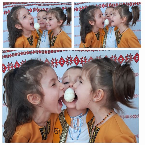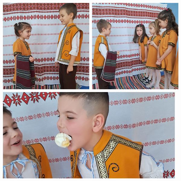 Облечени в национални носии, с богата трапеза за празника /питка, баница, сирене, яйца, халва/, спазвайки всички обичаи, те се докоснаха отново до българската традиция. „Простено. Прости” изрекоха един към друг малките врабчета. Настъпи голяма веселба с обичая „хамкане”. Завързаното за дълга пръчка яйце се мяташе към широко отворените детски уста. Децата знаеха какво повелява традицията – да отхапят от яйцето с уста, без да ползват ръчички. Който успее да отхапе първи, ще бъде здрав и честит през цялата година.